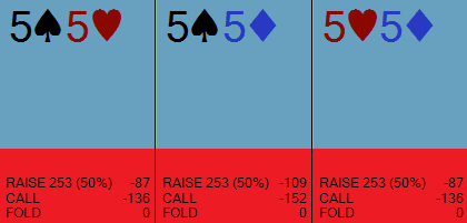 На самом деле здесь лучше блеф-кетчить c , чем с или даже с карманными десятками. Для справки: блеф-кетч с карманными десятками тех же мастей в мире GTO означал бы проигрыш 2,400bb/100 раздач.