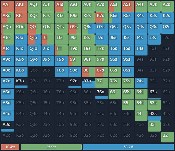 Против этого 3-бета Линусу следует защищаться с широким диапазоном, играя фолд примерно в 55% случаев. Хотя частота защиты очень похожа на ту, что была бы при стеке в 100bb, она представляет собой больше комбинаций, поскольку его диапазон опен-рейза был более лузовым. Мы увидим, что такие руки, как K7s, T7s, 86s, 75s, 64s и 53s, станут прибыльными коллами.