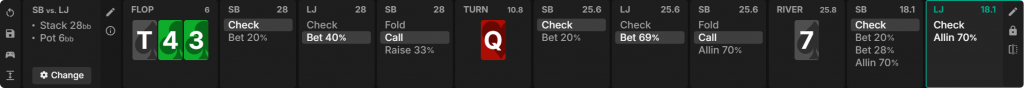 В качестве примера рассмотрим следующий сценарий. Это раздача из MTT, где мы открываемся с с LJ за 8-макс столом и получаем колл от SB при эффективном стеке в 30bb. Используем диапазоны ChipEV для этого спота, чтобы проиллюстрировать идею оценки шоудаун-вэлью.