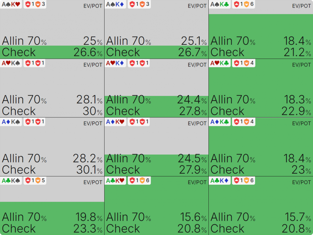 Это все наши комбинации AKo. В интерфейсе солвера рейтинг блокеров представлен в верхнем левом углу каждого прямоугольника, рядом с конкретной комбинацией. Левое число — это удаление вэлью, а правое — удаление мусора.