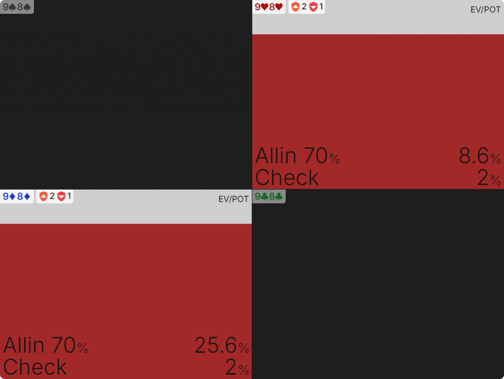 Для сравнения, вот взгляд на EV ставки и чека с 98s — очевидно, это большая разница. Хотя незначительные факторы блокеров, связанные с тем, что на терне выпадает , делают лучшим блефом, чем , мы блефуем с в 100% случаев, хотя это и приносит нам лишь 8,6% банка. Это связано с тем, что мы выигрываем только 2% банка, если играем чек, так как оппоненту крайне сложно когда-либо иметь руку хуже, чем 9-хай.