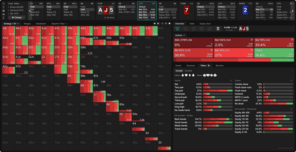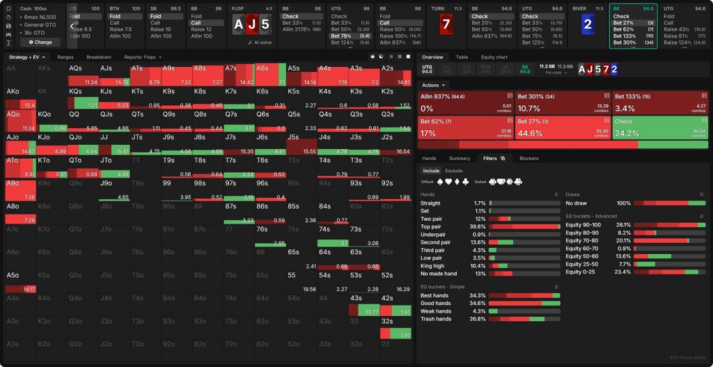 Наш первый пример — UTG против BB в сингл-рейз банке (SRP) при глубине 100bb. На двухцветном флопе UTG должен ставить практически всегда, при этом можно использовать практически любой доступный бет-сайзинг. В нашем примере UTG ставит примерно 75% банка, а BB коллирует.