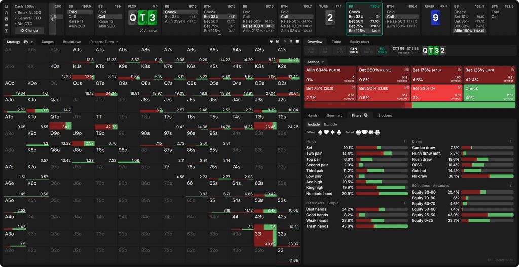 В этом сценарии BTN действует против BB в сингл-рейз банке при глубине в 200bb. На флопе BTN конт-бетит, BB чек-рейзит, и BTN коллирует. На терне предпочтительный сайзинг BB — овербет. Помните, что эта раздача проходит при начальной глубине в 200bb, поэтому у BB есть существенный стимул поляризовать свой диапазон, выбирая эту агрессивную линию. Диапазон BB на этом тёрне интуитивно понятен: вэлью сосредоточено вокруг двух пар и лучше, в то время как блеф варьируется между различными дро и руками, такими как K3s, которые блокируют сильнейшие руки в диапазоне BTN.