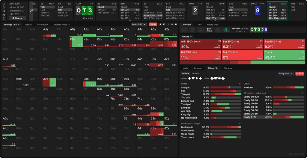 На ривер приходит , и BB теперь в основном использует сайзинг овербета, когда ставит. Фильтруя руки с 25% эквити или меньше, становится ясно, что миснутые флеш-дро составляют очень большую часть диапазона блефа BB.