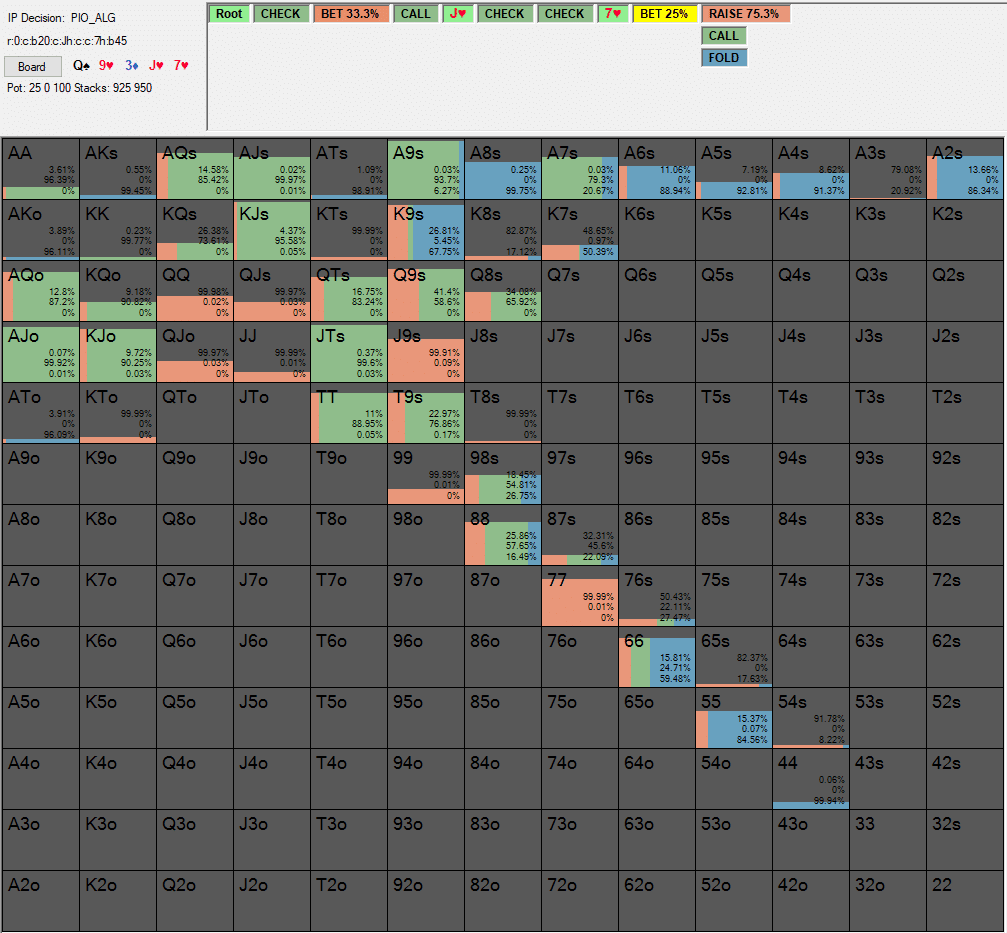 Ниже представлена оптимальная защита IP-игрока против блок-бета в 25% банка в сценарии, который мы рассматривали ранее: