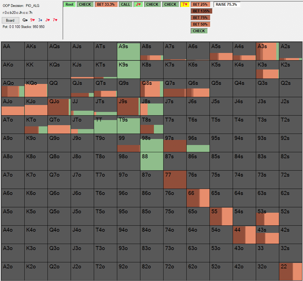 Причина того, что обычно блок-беты используются солвером вне позиции, состоит в том, что он превентивно защищается от тонких вэлью-бетов, чекая с большим количеством своих натсовых рук. Затем он отрицает эквити потенциальных блок-бетов на вэлью, делая очень крупные чек-рейзы на сбалансированном диапазоне. Это означает, что потенциальные тонкие вэлью-беты в позиции обычно действуют лучше, играя ответный чек, чтобы избежать проигрыша банка более слабой руке.