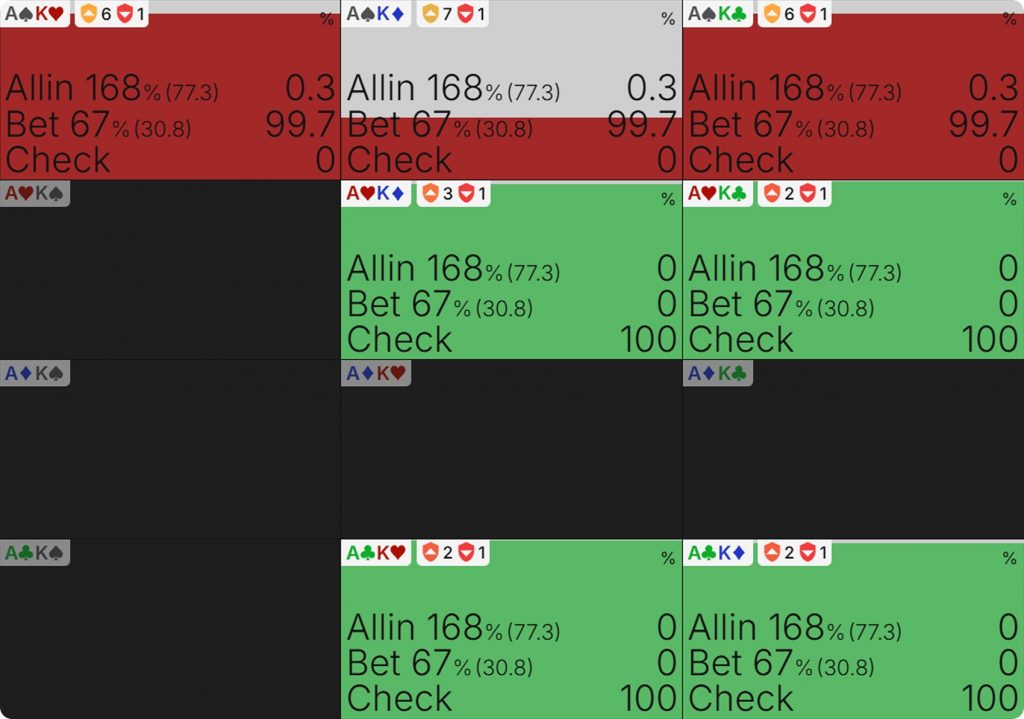 Однако прежде чем мы углубимся в вышесказанное, давайте рассмотрим пример того, как солвер набирает свою команду. Рассмотрим следующий спот: 100bb, UTG vs BB, сингл-рейз банк (SRP). Мы на ривере, финальный борд: . UTG поставил 67% банка на флопе и 169% банка на терне, а BB оба раза сыграл чек-колл. BB чекнул на ривере, и UTG теперь может запушить сайзингом 168% банка или сделать чек.