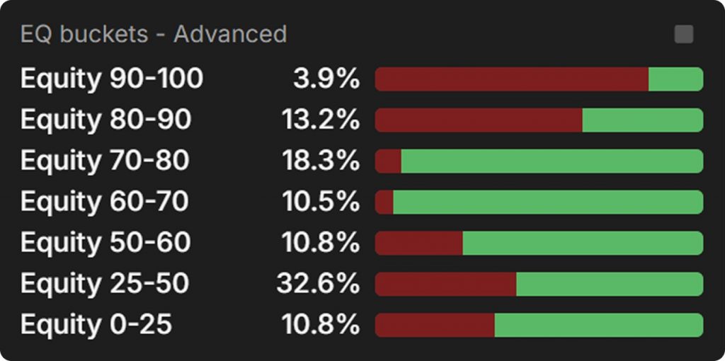 Стратегия конт-бета BTN (253% банка) против BB на A-K-6, сгруппированная по корзинам эквити:
