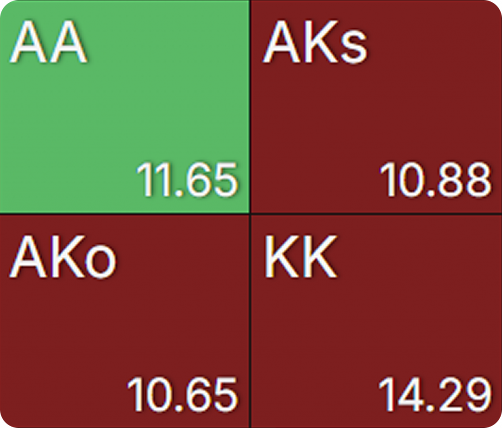 Ответ — карманные тузы, поскольку они обладают мощным блокирующим эффектом на руки диапазона продолжения большого блайнда, которые, скорее всего, станут разыгрывать крупный банк. Поскольку большой блайнд вряд ли заколлирует три ставки без туза, BTN смиряется с тем, что получит только две улицы вэлью, на которые он может уверенно рассчитывать, начав игру на постфлопе с чека. Как видите, этот блокирующий эффект приводит к гораздо более низкому математическому ожиданию (EV) для тузов, чем для королей: