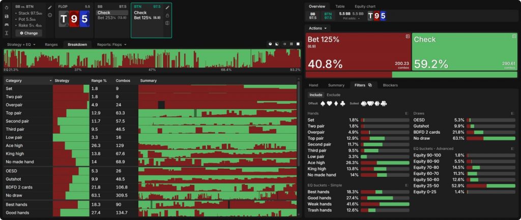 Хотя флоп T-9-5 радугой сильно отличается от текстуры A-K-6 радугой, он также входит в число флопов BTN с наибольшим количеством овербетов, наряду с похожими бордами, такими как J-9-5, T-3-2 и T-5-4. Даже при использовании нескольких размеров ставок, более половины конт-бетов BTN на T-9-5 радугой — это овербеты.
