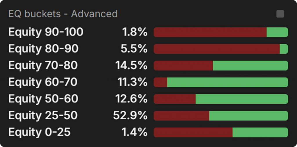 Самая слабая рука BTN, , имеет 16% эквити. Не очень много, но гораздо больше, чем у самой слабой руки диапазона овербета на ривере. Но BTN редко блефует с этой рукой, когда она находится на самом дне его диапазона, ближе всего к воздуху. BTN с одинаковой частотой блефует как с руками в районе 25–50% эквити, так и с руками в районе 0–25% эквити. Даже довольно большое количество рук с эквити 50–60% делают ставки.