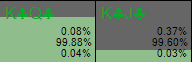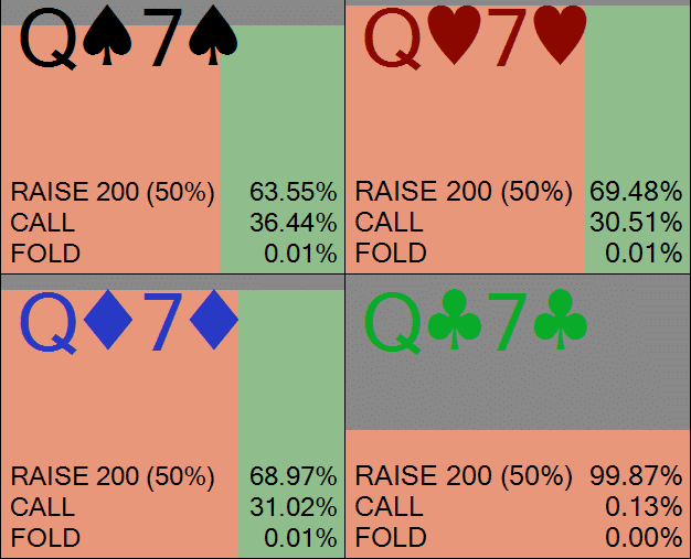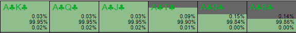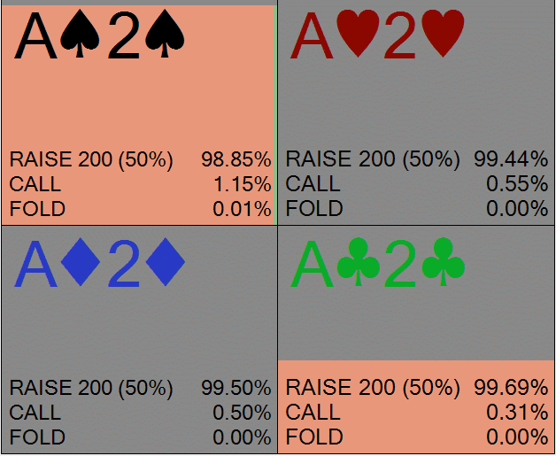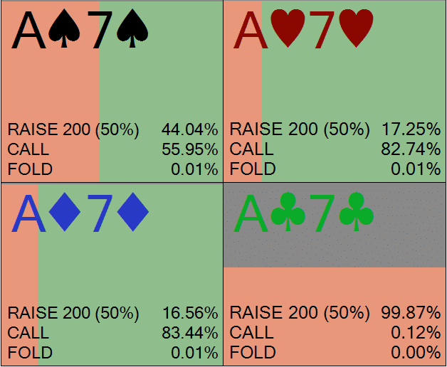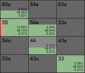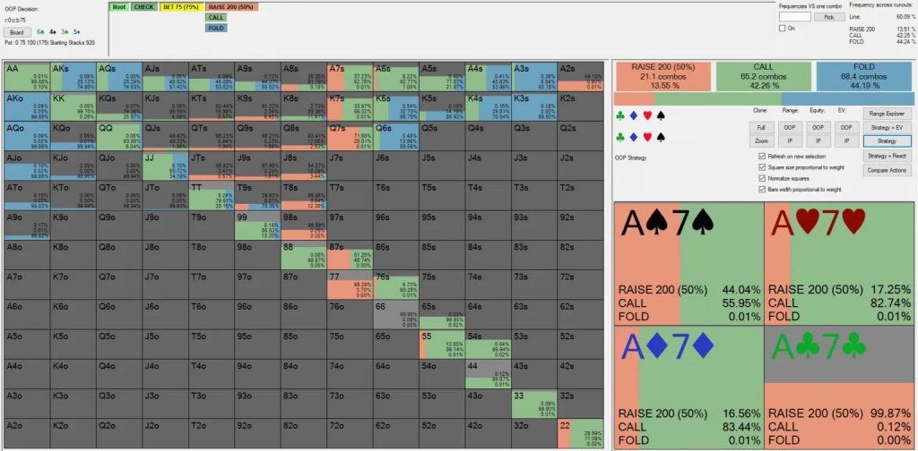 В правом верхнем углу вы видите, что солвер выбирает чек-фолд с 44,19% диапазона; это обозначено синими прямоугольниками. Учитывая, что баттон делает ставку в 75% банка, эта частота фолда очень близка к минимальной частоте защиты (МЧЗ), которая составляет приблизительно 43%.