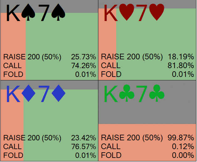 Солвер выбирает чек-колл с 42,26% диапазона и чек-рейз с оставшимися 13,55%.
