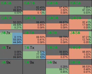 Чтобы баттон не смог овер-реализовать свое эквити с помощью полублефов, нам необходимо с высокой частотой продолжать с этими руками. Исключения составляют K6s и Q6s, которые являются низкочастотными продолжениями из-за отсутствия подходящих блокеров.