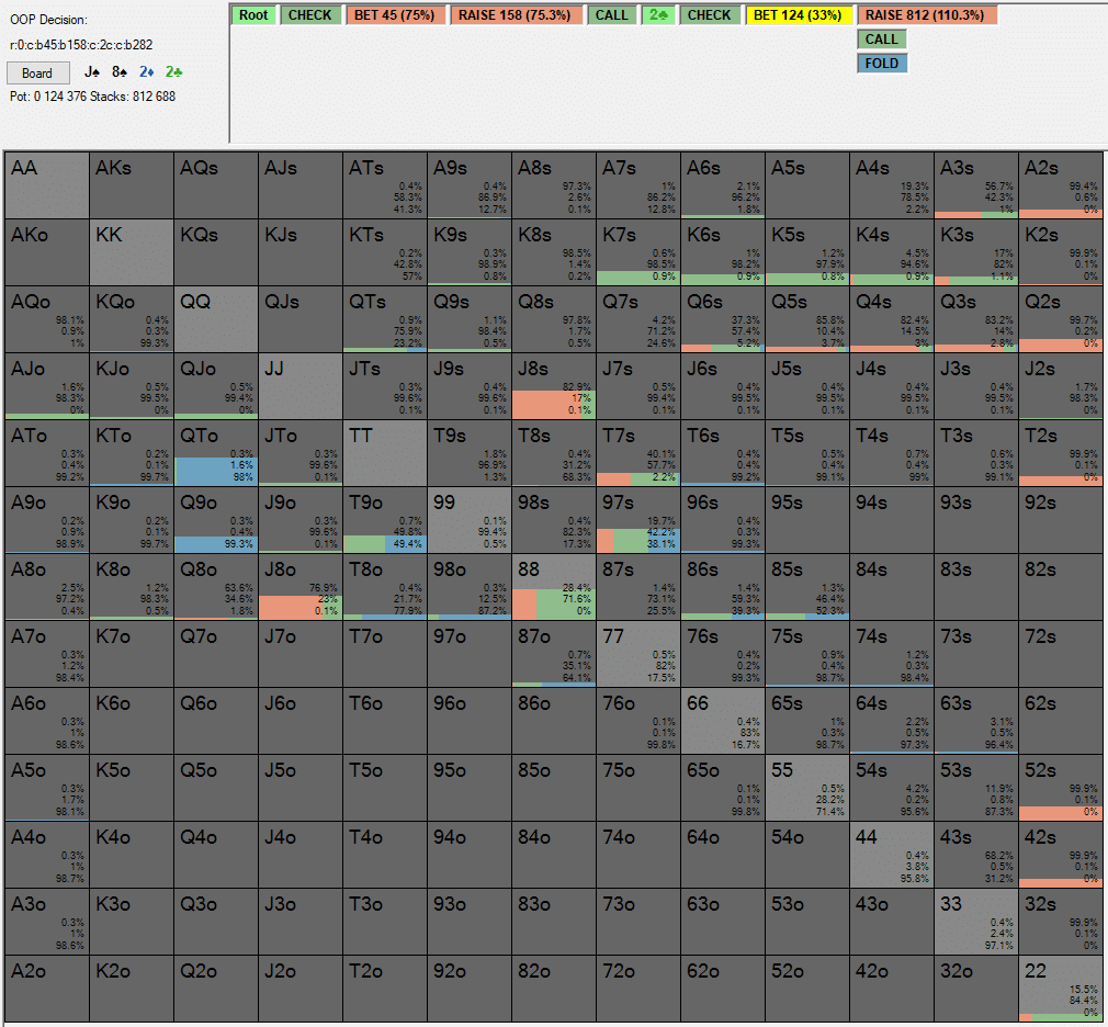 Наконец, солвер чек-коллит со всеми топ-парами и использует смешанную стратегию с 8x-руками, чтобы держать блефы баттона под контролем, максимально приближая его к индифферентности.