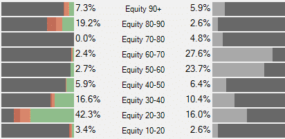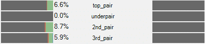 Если помните, на тернах 2x и Jx 24% и 30% диапазона BTN составляли руки с 70%+ эквити. На тернах 8x это значение резко снижается — теперь лишь 14% диапазона баттона обладают таким крупным эквити.