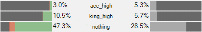 Мы видим, что А-хай и K-хай флеш-дро предпочитают чек-колл, поскольку у них уже есть приличное эквити. В то же время Q-хай флеш-дро отдают предпочтение чек-рейзу, стремясь лишить эквити К-хай флеш-дро баттона и избежать попадания в ситуацию с обратно потенциальными шансами банка.
