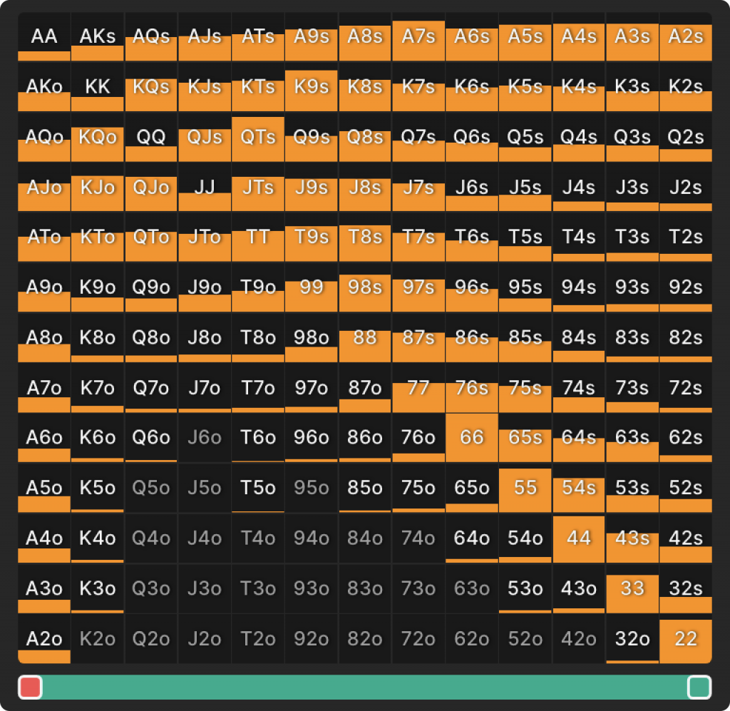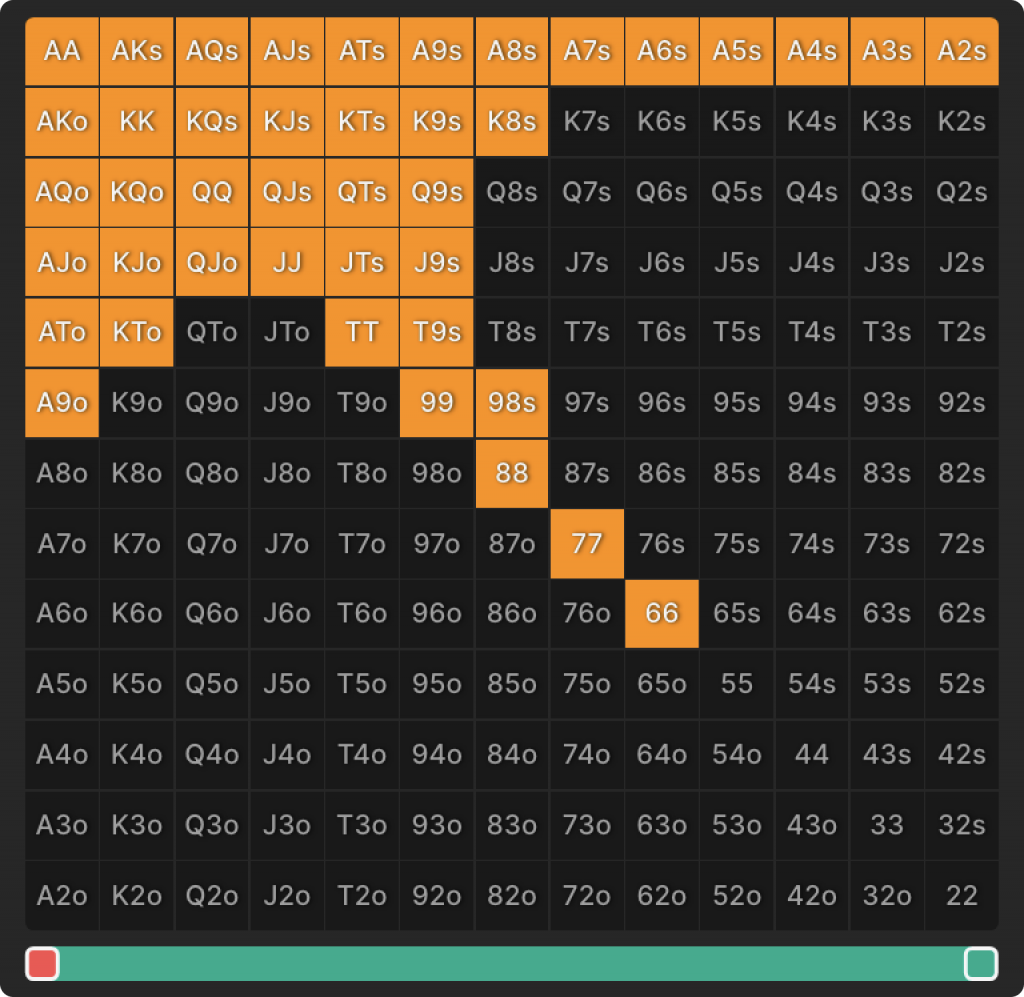 Этот диапазон предназначен для более удобной навигации на постфлопе при более низком значении SPR. Он обладает хорошим эквити против широких спектров лимп-колла и доминирует над этими спектрами. Вы могли привыкнуть думать о A9 как о легко доминируемой руке, но против оппонента, разыгрывающего любой Туз и многие худшие 9x-руки, вы часто будете доминировать над его диапазоном. Кроме того, позиционное преимущество будет полезным инструментом для блефа, получения тонкого вэлью, пот-контроля и даже минимизации потерь со вторыми лучшими руками.