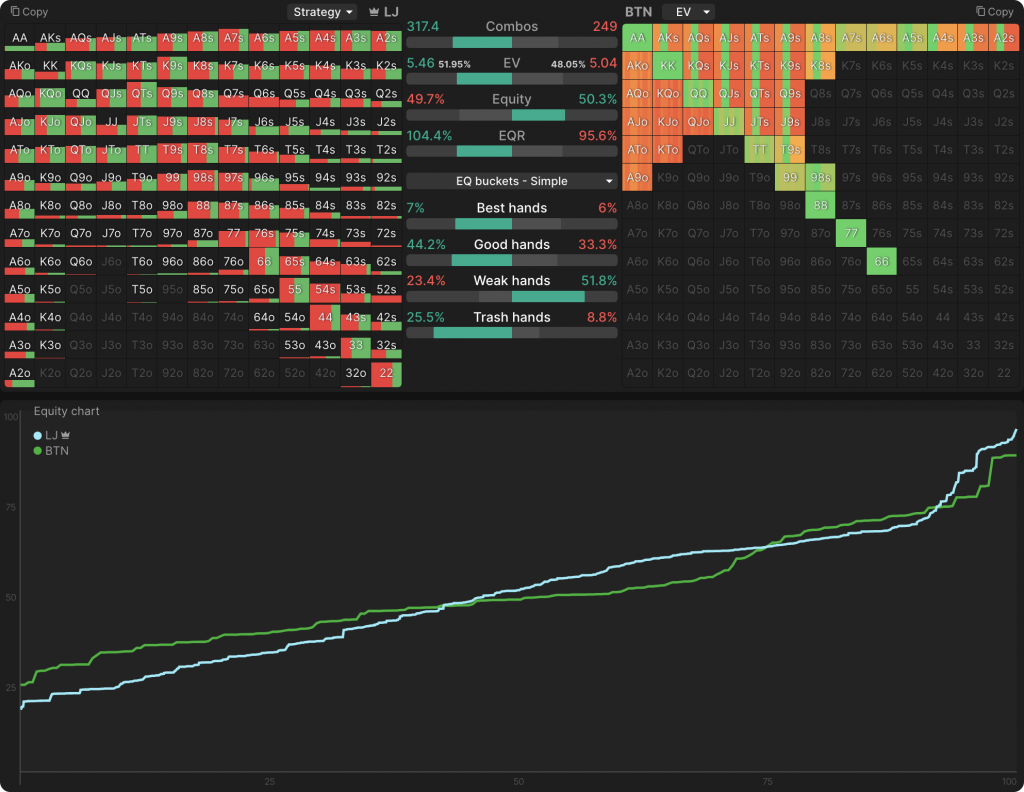 Распределение эквити диапазонов на флопе (слева = лимп-коллер с LJ, справа = рейзер с BTN):