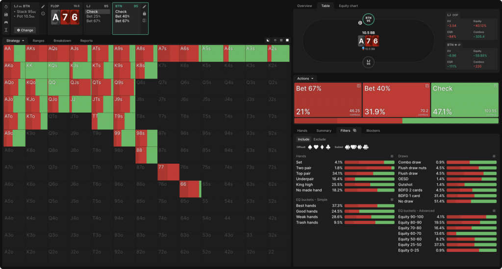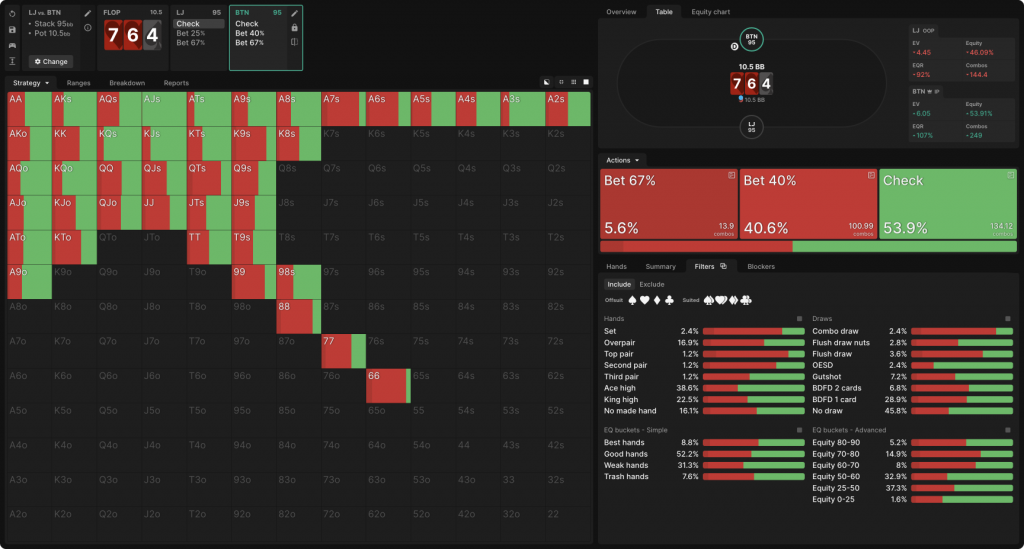 Изменение одной карты на флопе с целью устранения возможности готового стрита (и некоторых дро) и введения большего количества пар в диапазон BTN кардинально меняет динамику. На флопе BTN обладает 56% эквити и более сильным спектром на всем протяжении графика распределения эквити. Это способствует гораздо более высокой частоте конт-бетов и некоторым более крупным ставкам.