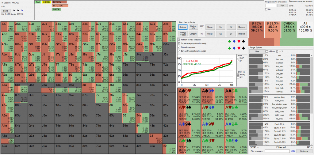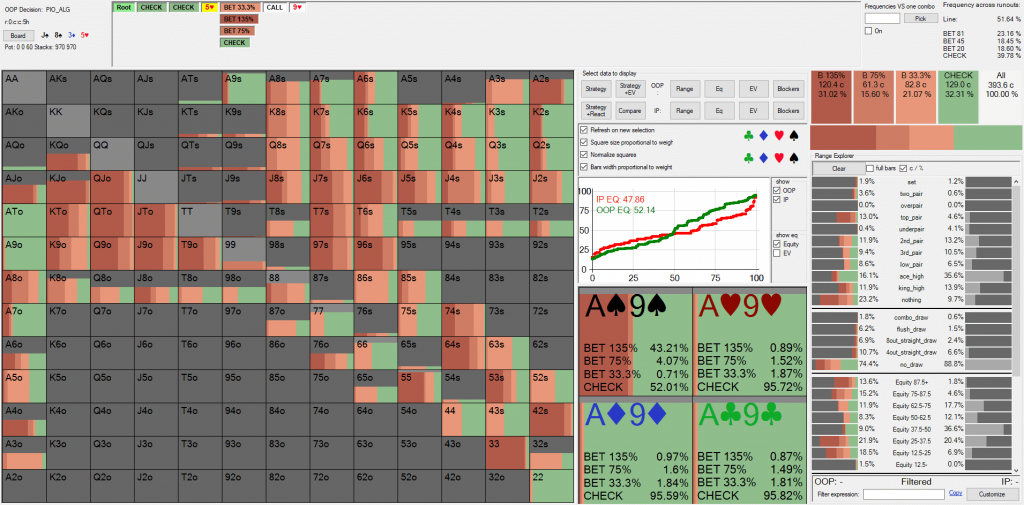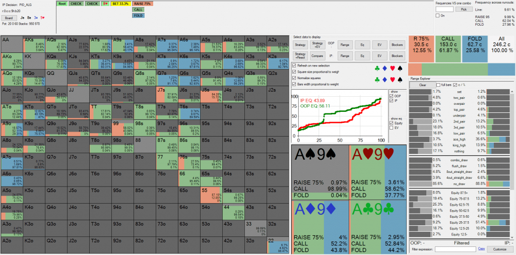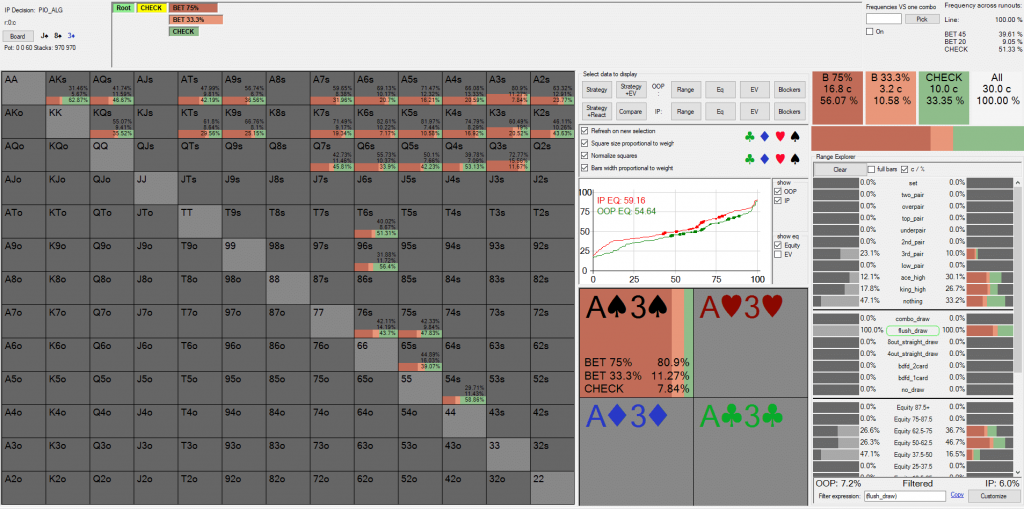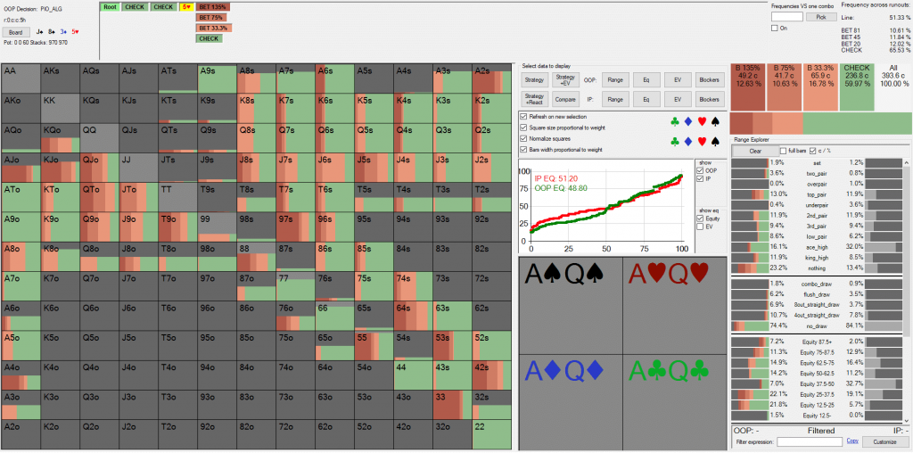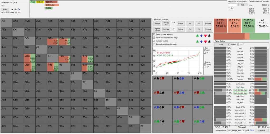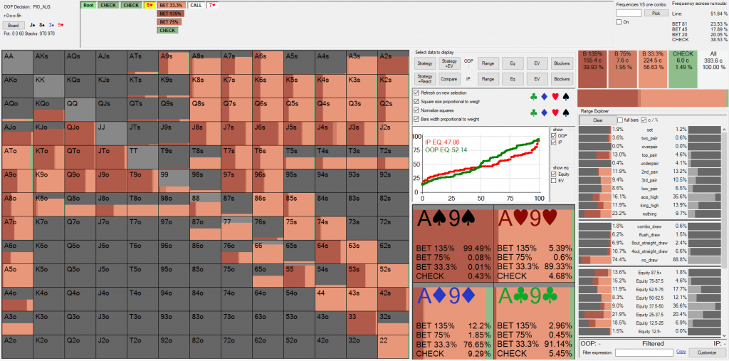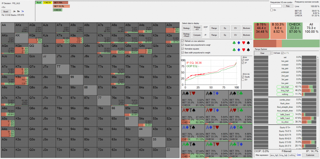 Солвер миксует между чеком и ставкой со следующими руками: карманные тузы примерно в 50% случаев, AJ около 20%, KJ около 60%, QJ около 70% и J7s–J5s около 90%.