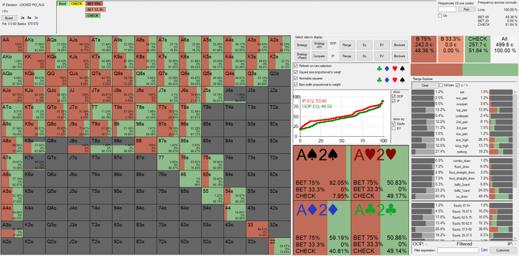 Прежде чем углубляться в детали, важно отметить один ключевой нюанс: у солвера почти в два раза больше слабых блефов, чем сильных блефов — 44 комбинации против 28.