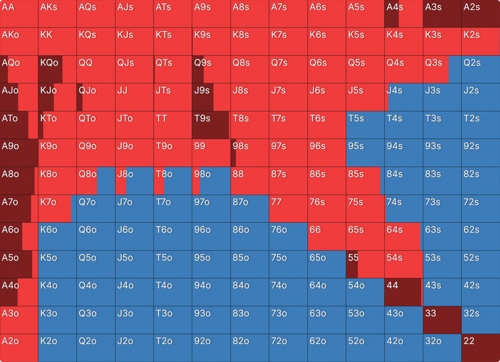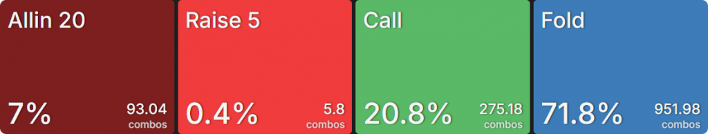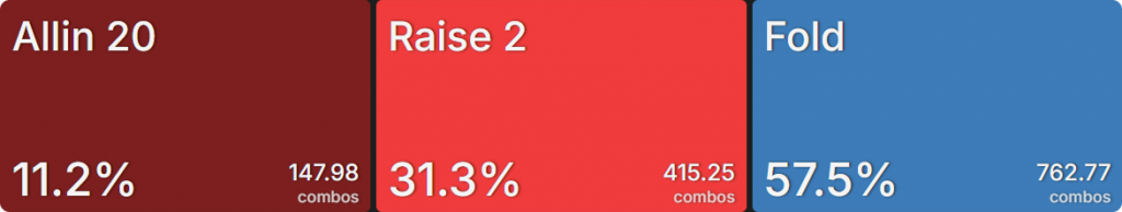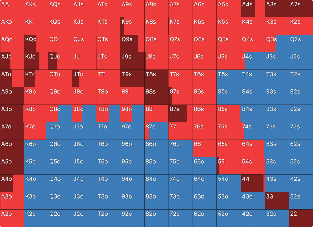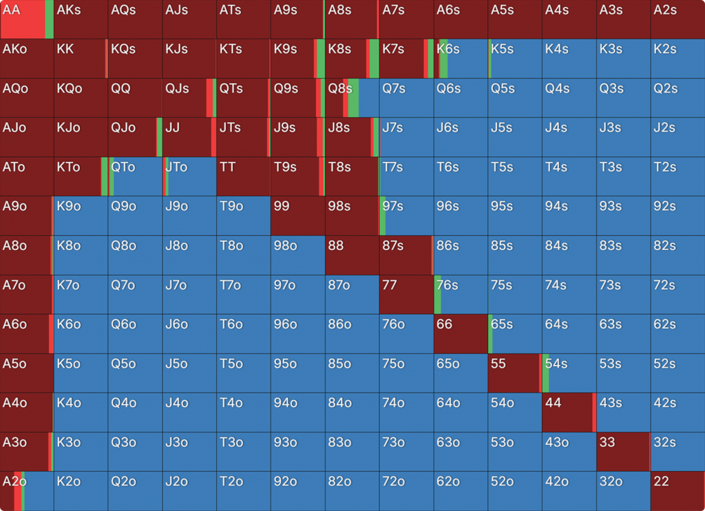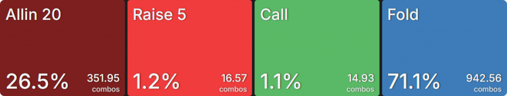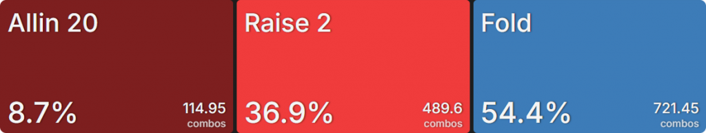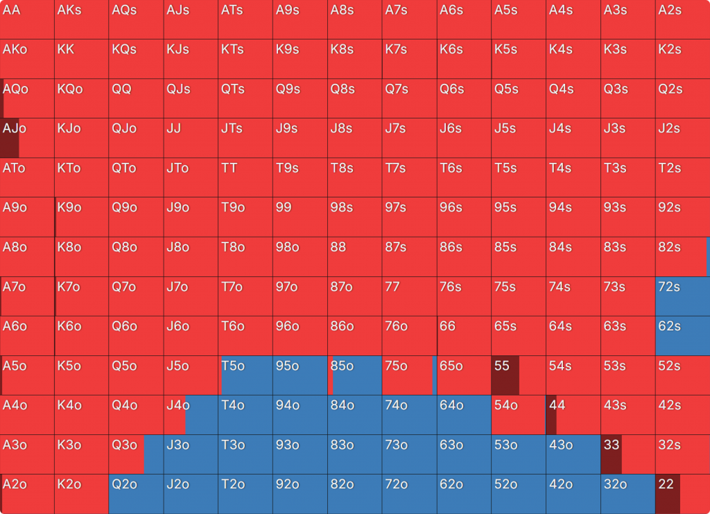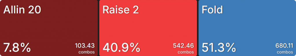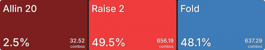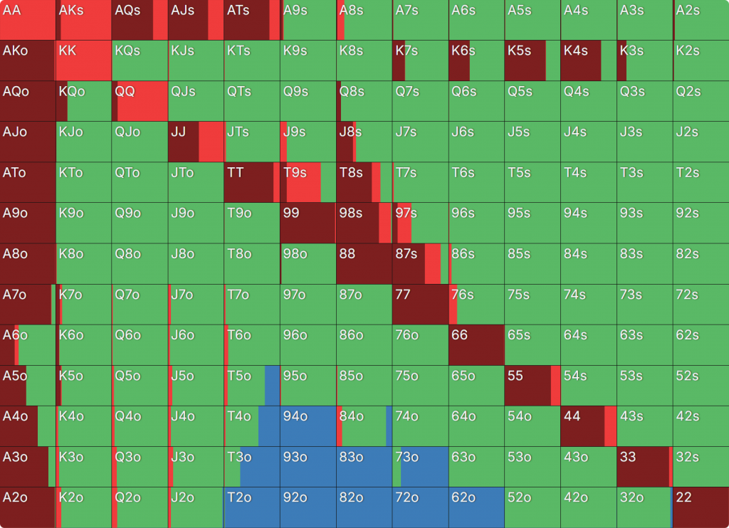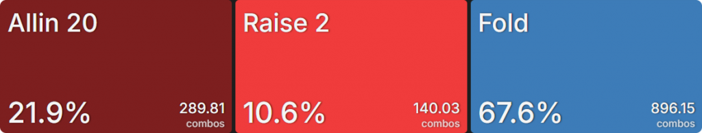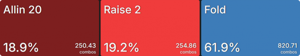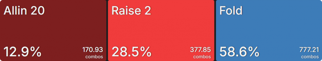 Прежде всего давайте посмотрим на GTO-стратегию, которая разделяет свои действия. Ниже представлен диапазон BTN (chipEV) при эффективной глубине 20bb, когда все остальные игроки фолдят. Обратите внимание, что в игре есть анте большого блайнда.