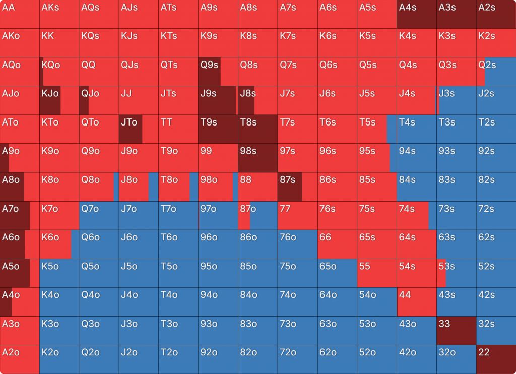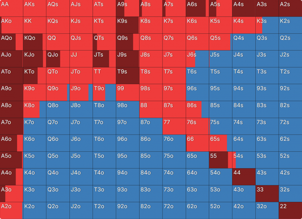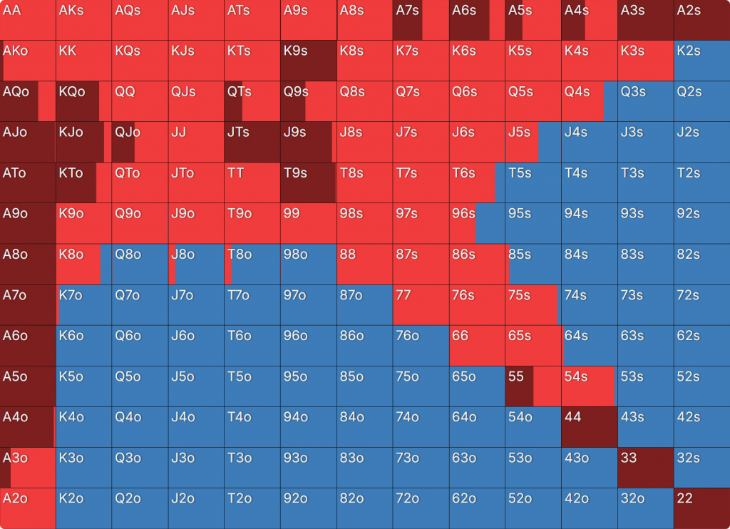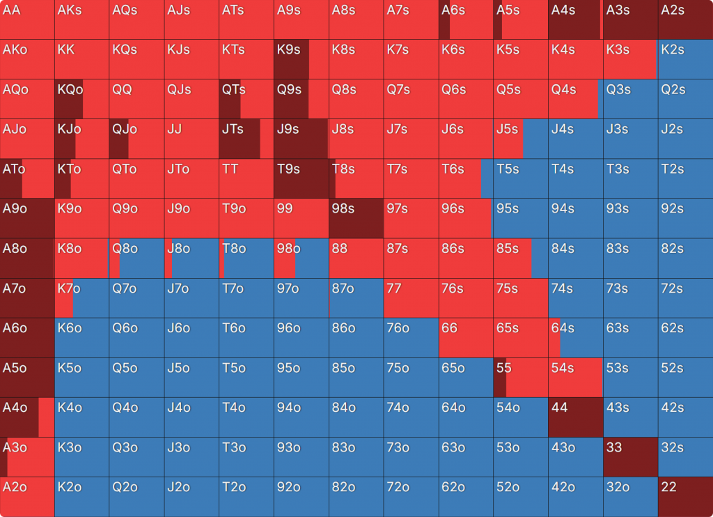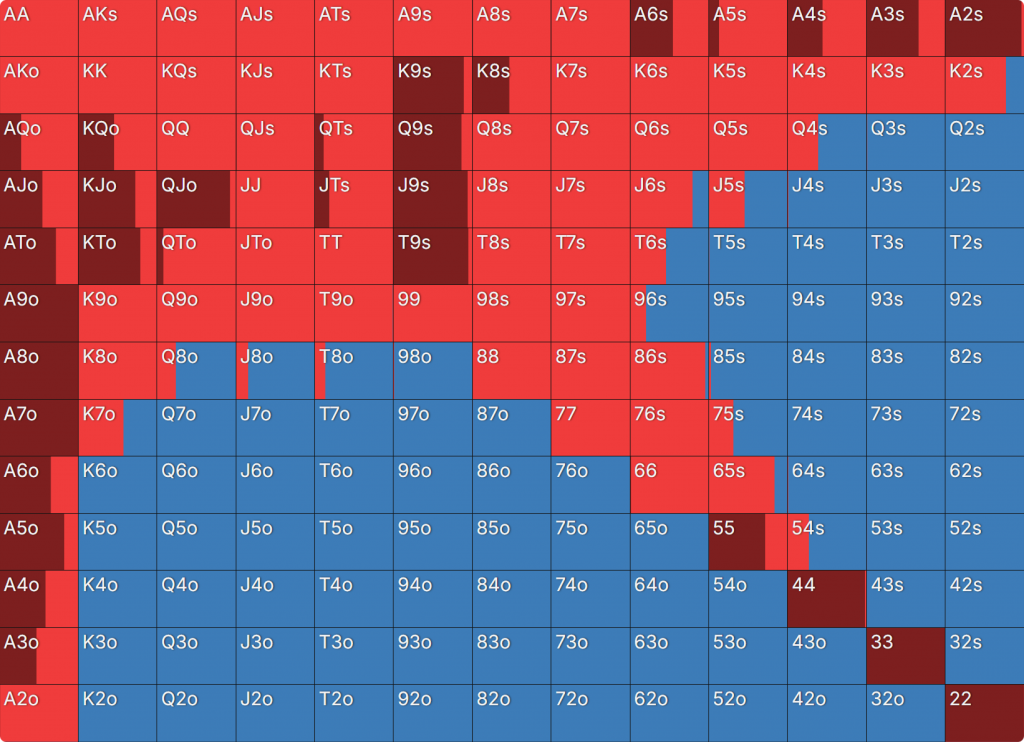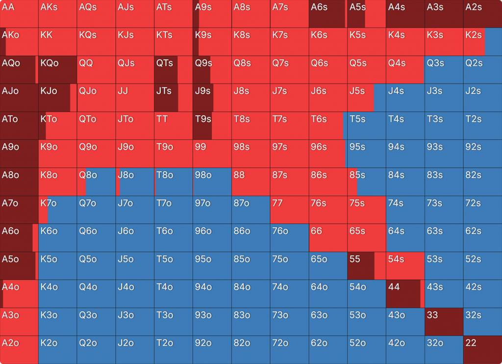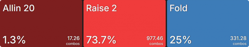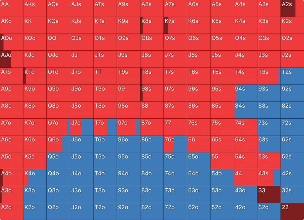Прежде всего давайте посмотрим на GTO-стратегию, которая разделяет свои действия. Ниже представлен диапазон BTN (chipEV) при эффективной глубине 20bb, когда все остальные игроки фолдят. Обратите внимание, что в игре есть анте большого блайнда.
