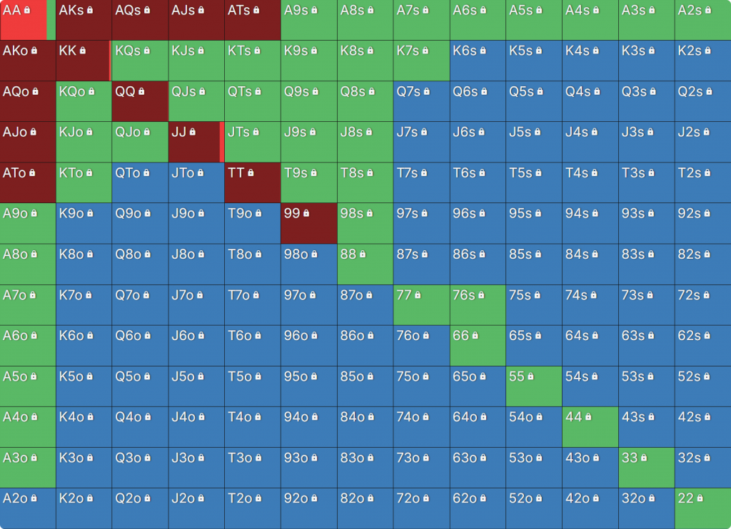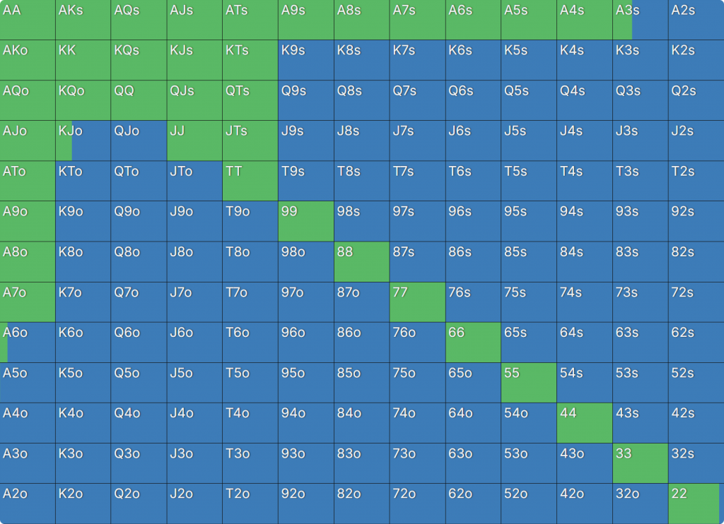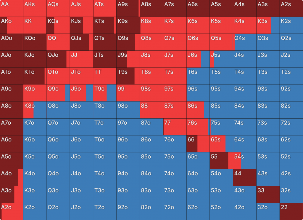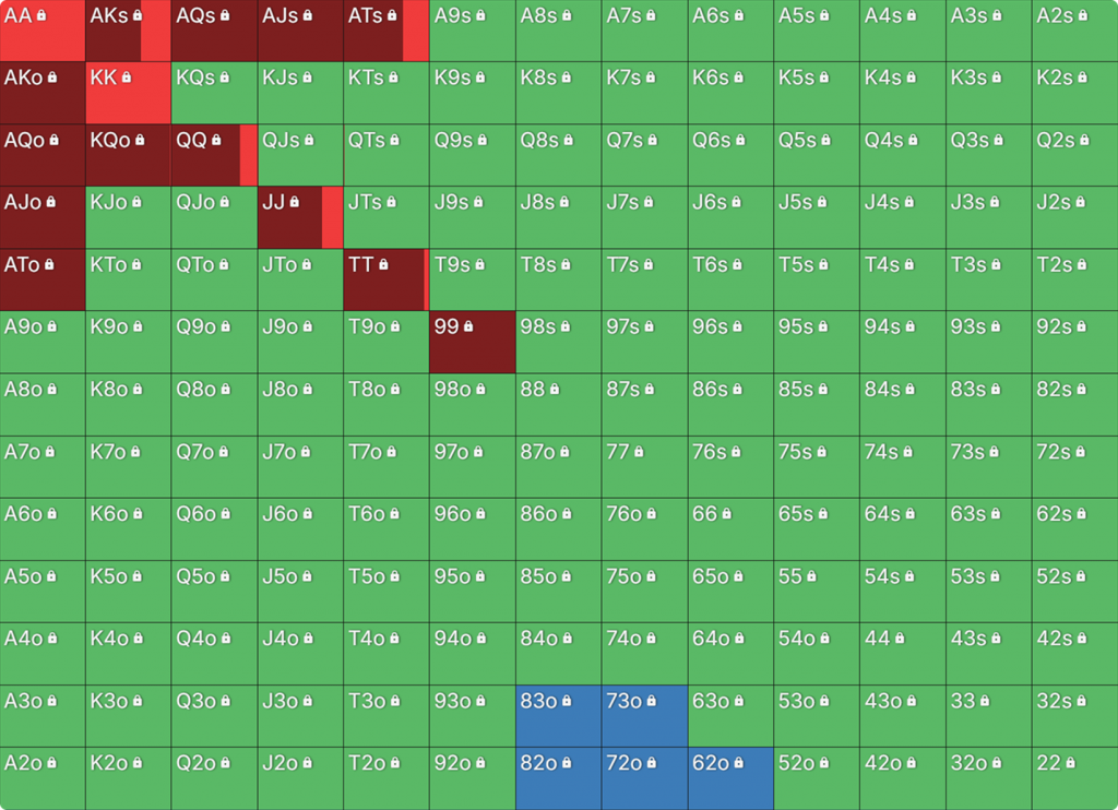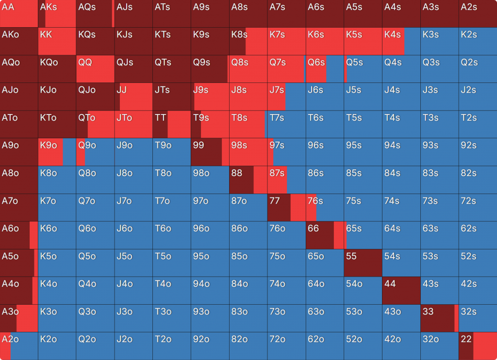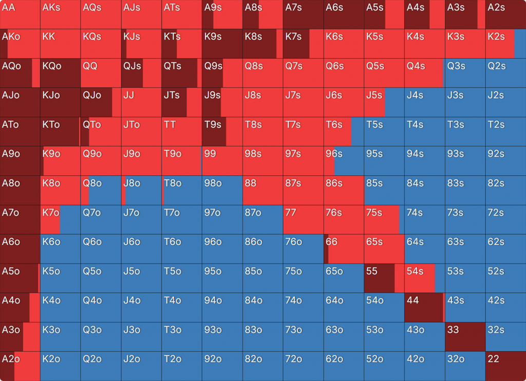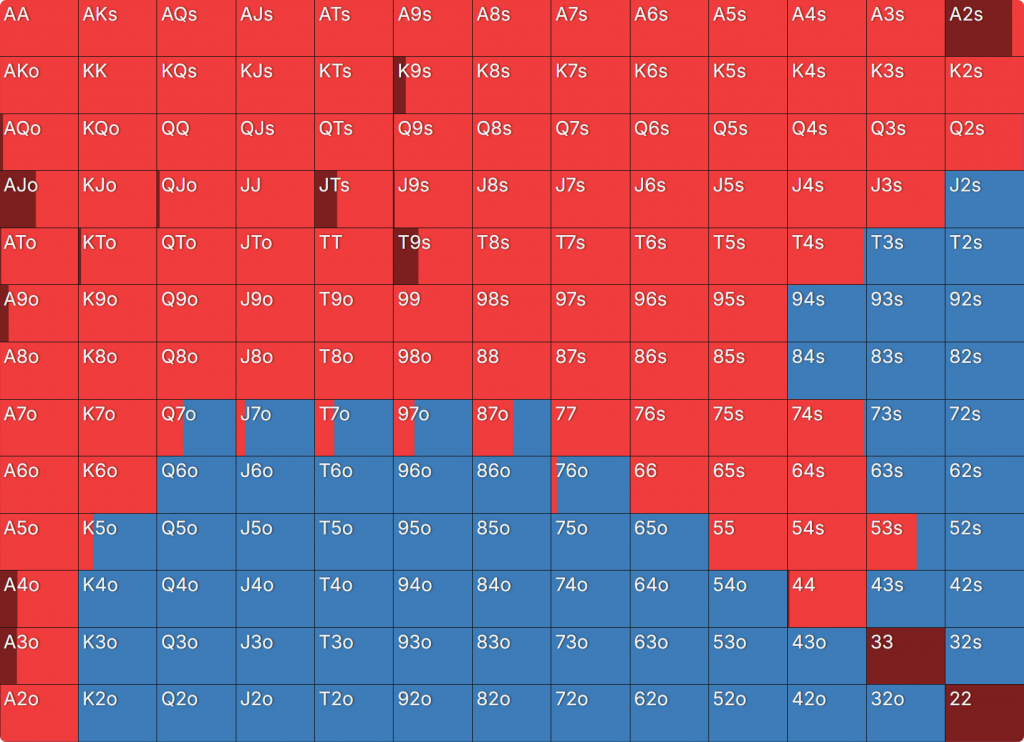 Прежде всего давайте посмотрим на GTO-стратегию, которая разделяет свои действия. Ниже представлен диапазон BTN (chipEV) при эффективной глубине 20bb, когда все остальные игроки фолдят. Обратите внимание, что в игре есть анте большого блайнда.