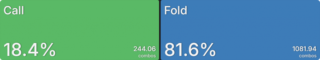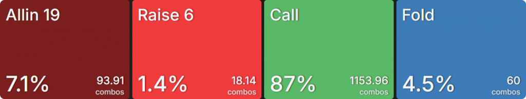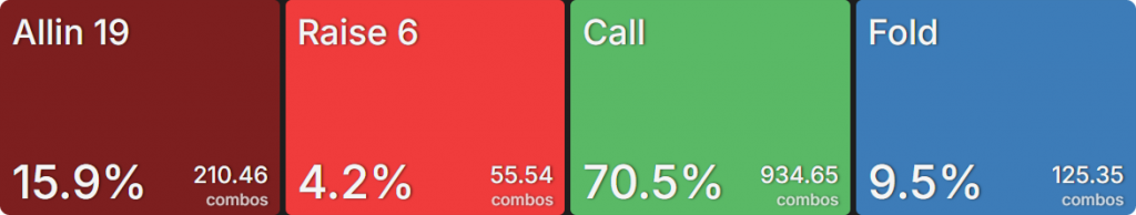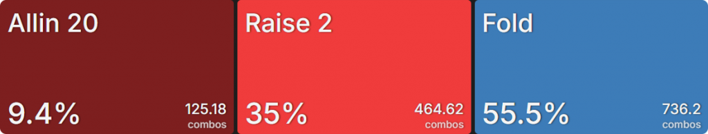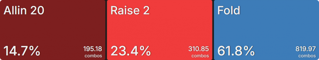 SB продолжает почти исключительно пушем (топ 26,5% рук). Относительно небольшая глубина стеков означает, что играть на стек не так рискованно. А тот факт, что SB находится вне позиции (OOP), делает колл менее ценным. BB приближается к частоте рейза SB, но не совсем достигает ее. Это связано с тем, что колл для BB гораздо более жизнеспособен, чем для SB. Он получает более привлекательную цену на колл, и ему не нужно беспокоиться о том, что кто-то позади него нарушит его планы. Это опция, которую предпочитают 70,5% рук.