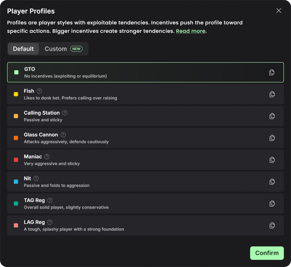 Одним из наиболее полезных аспектов нового префлоп-нодлокинга является то, что вы можете применять профили к игрокам, чтобы процесс солвинга учитывал отклонения от GTO. Мы смоделировали ряд профилей игроков. В этой статье мы будем использовать профили телефона, нита и маньяка. Вы также можете создавать свои собственные пользовательские профили. Вот полный список предустановок: