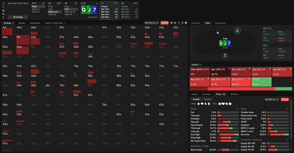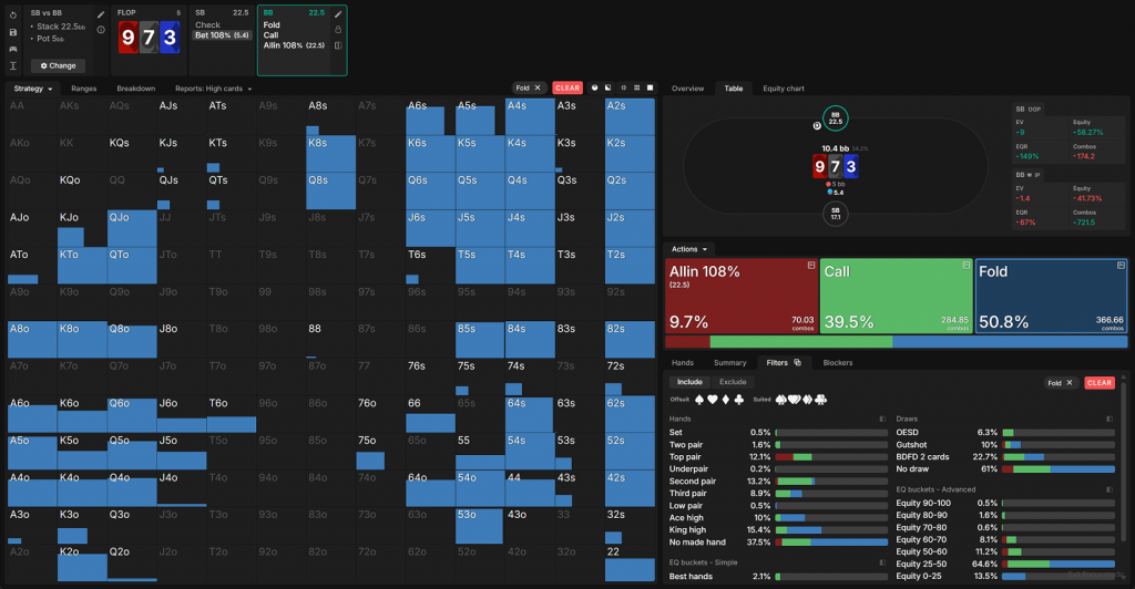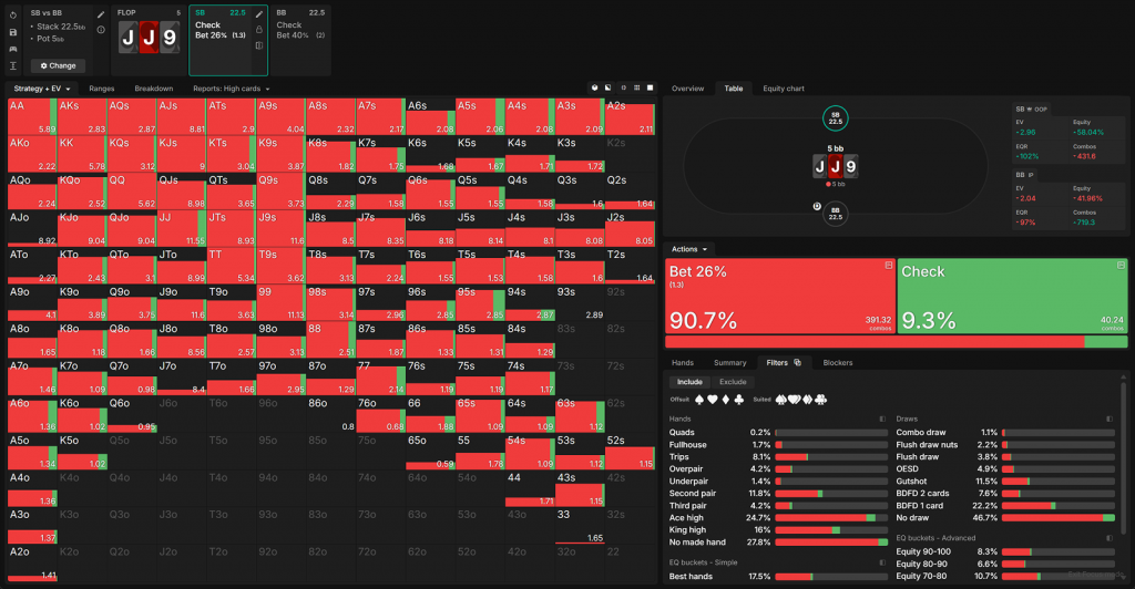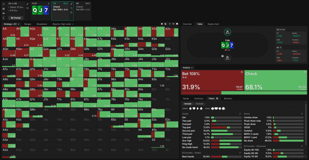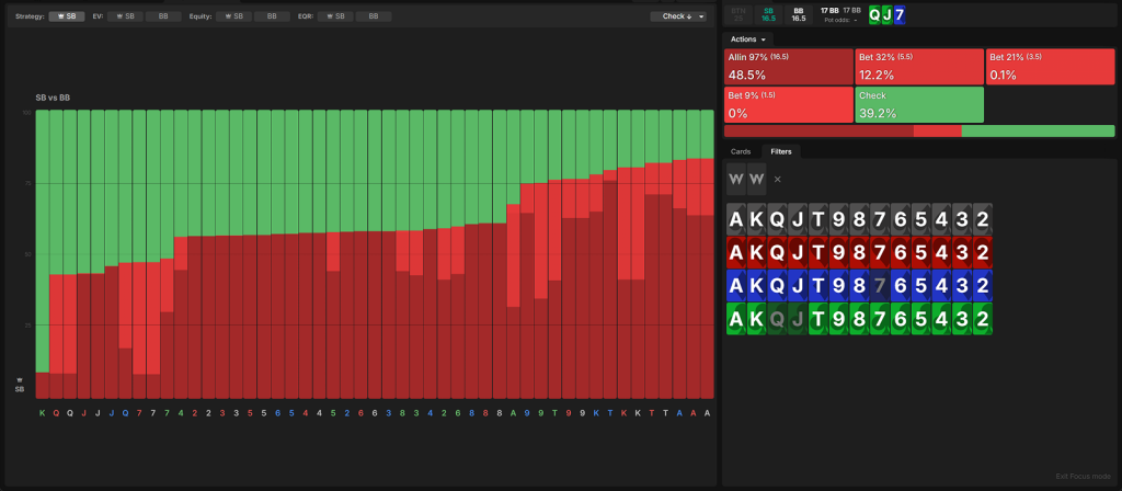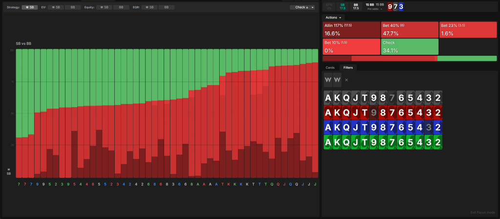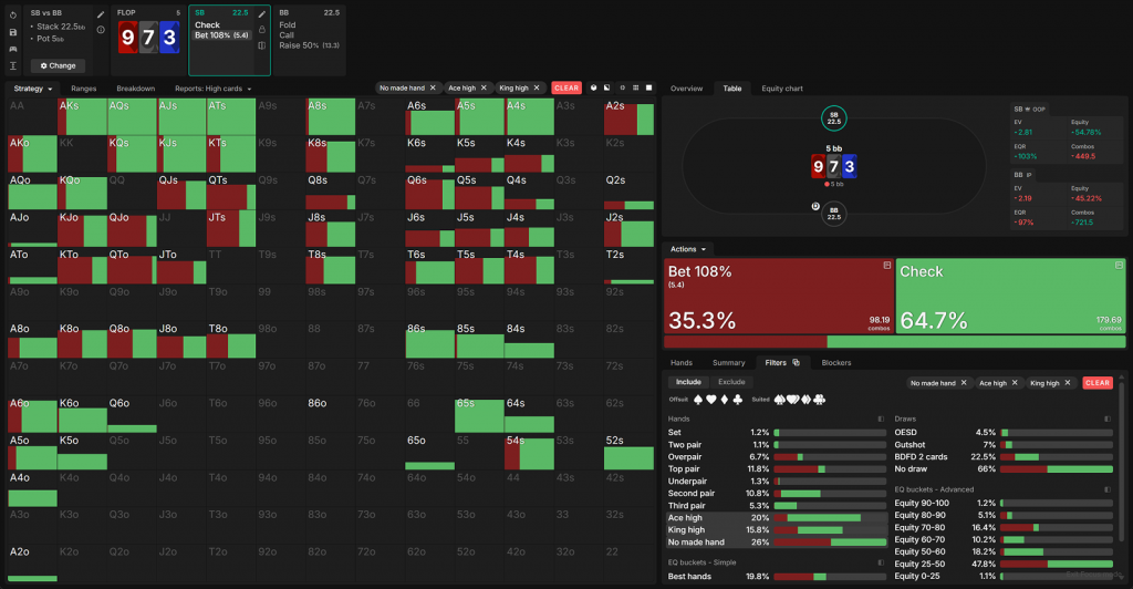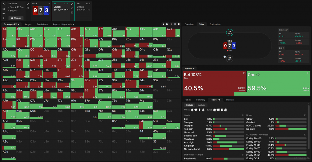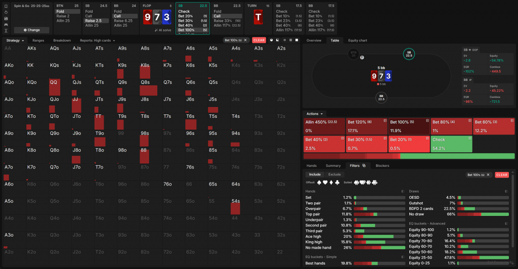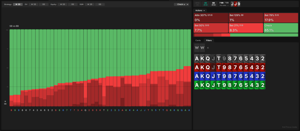 В нашем примере средняя и нижняя карты флопа — это валет и семерка, и мы видим, что это те терны, на которых у SB высокая частота чека.