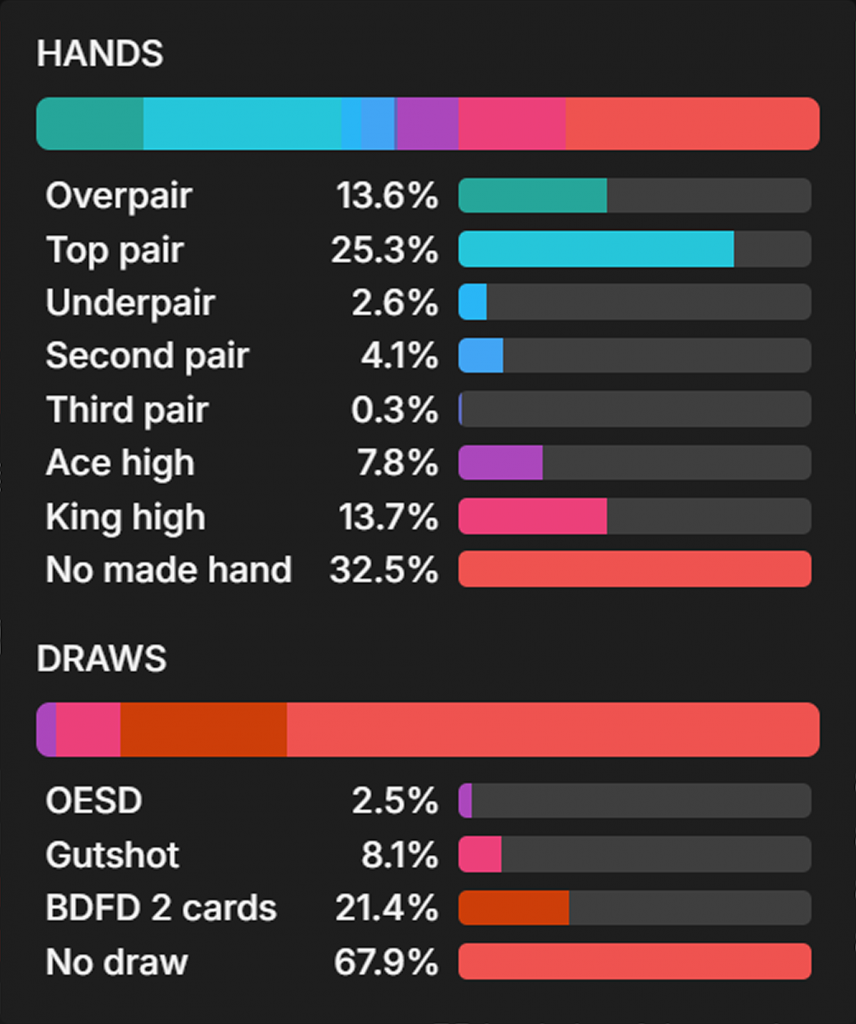 - Почти вся совокупность рук обоих диапазонов содержит как минимум пару или прямое (небэкдорное) дро. Руки без пары и без прямого дро составляют менее 10% от всех возможных рук, дошедших до флопа.