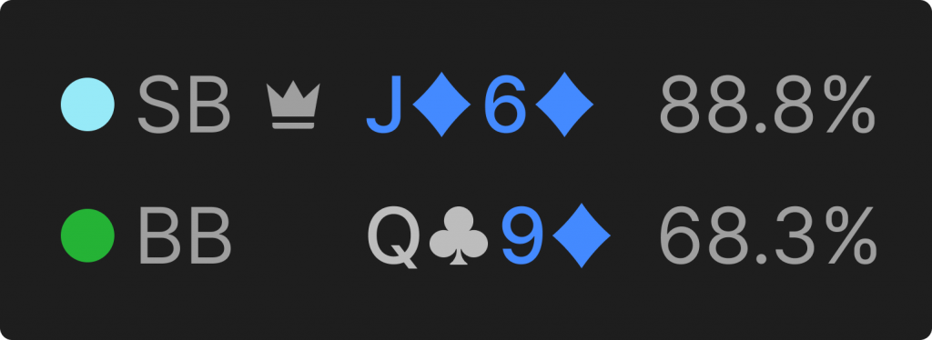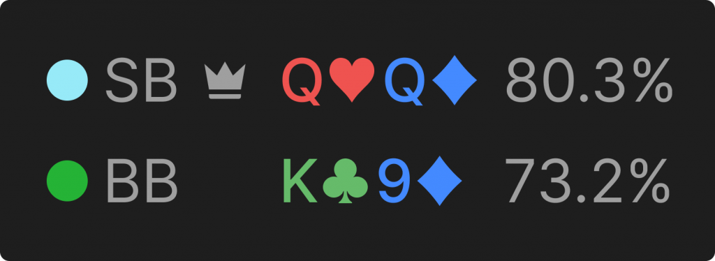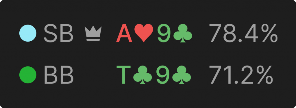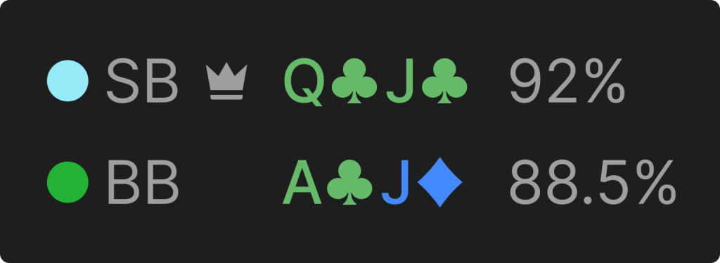 Мы видим, что даже , которые входит в топ-5% рук SB, имеют 80,3% эквити на флопе . В то время как , которые входят в топ-5% рук SB на флопе , имеют 92% эквити.