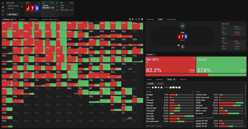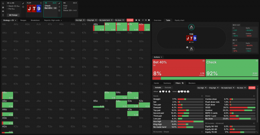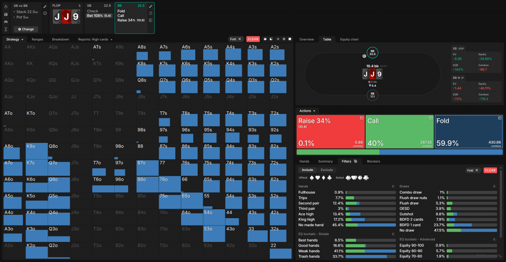 На этих очень связанных досках блефы будут в основном состоять из дро. Поскольку почти все руки содержат либо пару, либо дро, когда у нас нет ни того, ни другого, в роли SB вполне можно просто чек-фолдить.
