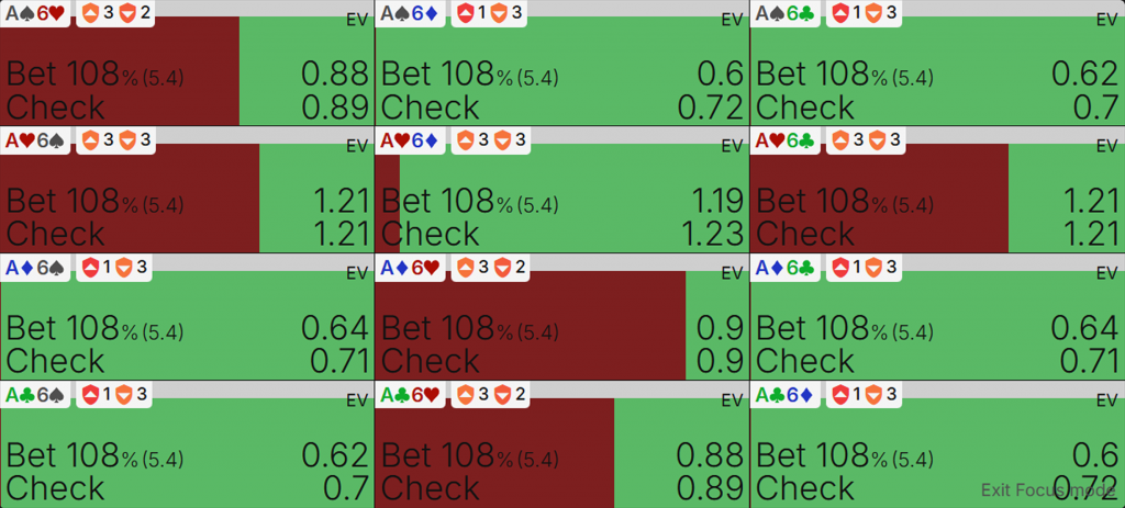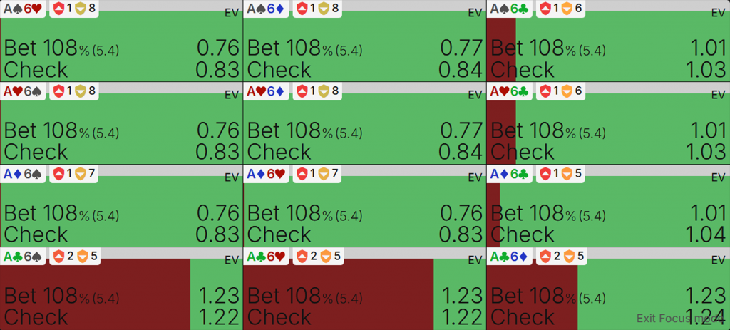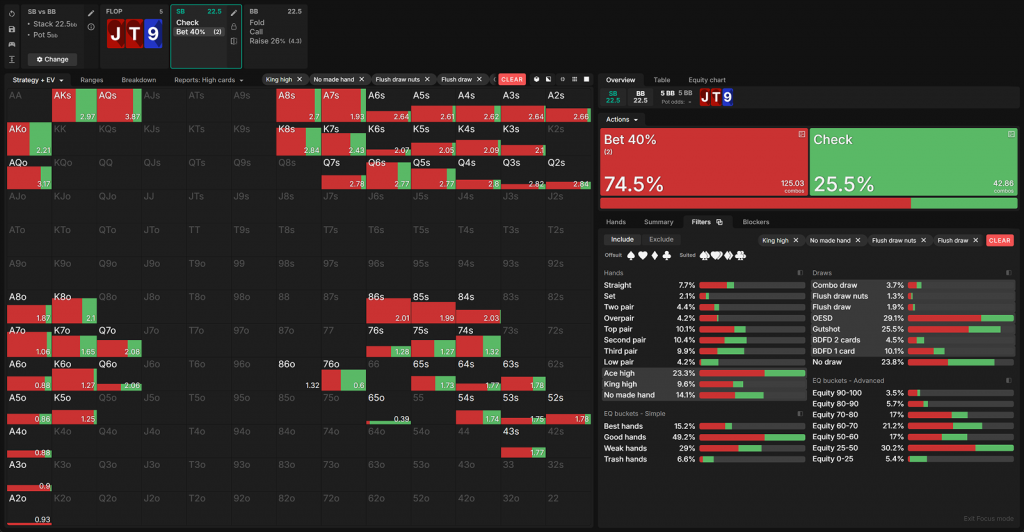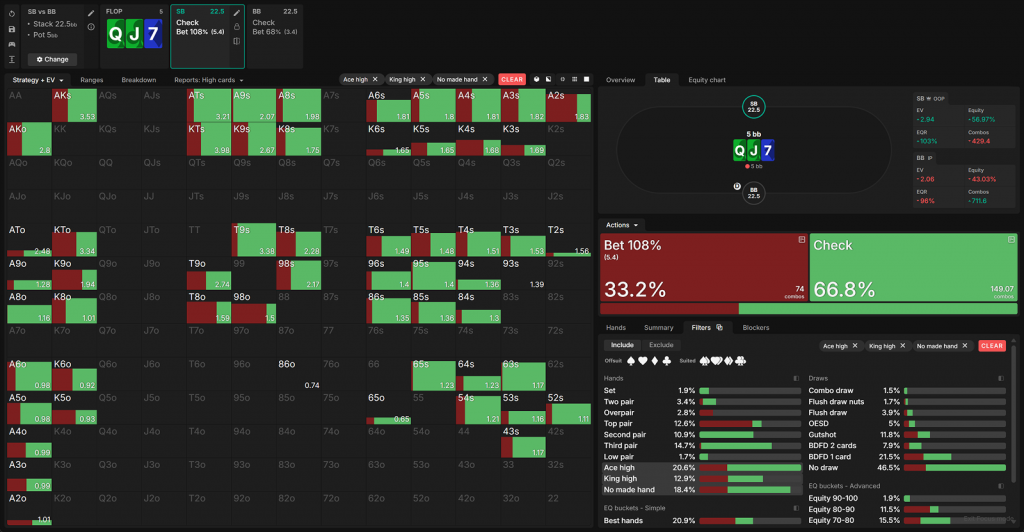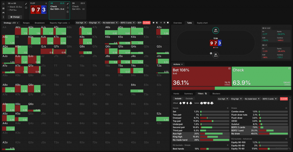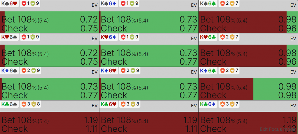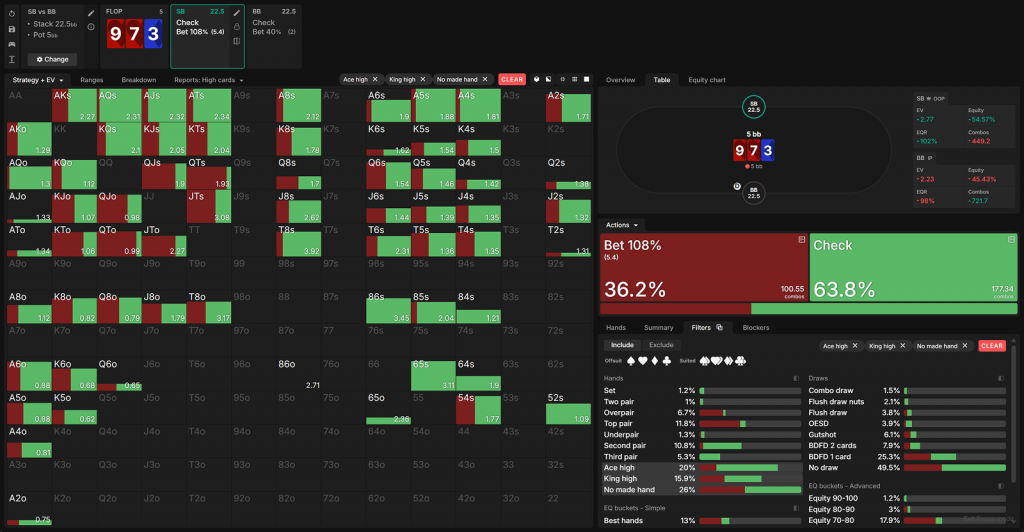 На таком типе досок, когда у SB есть преимущество в верхней части диапазона, а у BB также есть значительное количество очень слабых рук в нижней части спектра, солвер часто будет использовать крупный сайзинг конт-бета на флопе (если ему предоставлен выбор).
