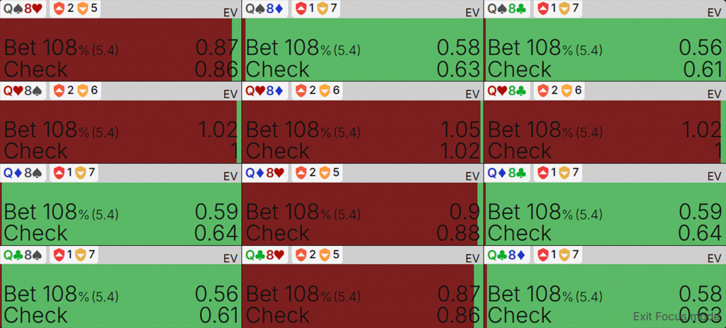 Снова посмотрев на руку из 90-го перцентиля, , класс рук с наибольшим эквити против нее, которые фолдят, — это гатшоты с бэкдорным флеш-дро, такие как , у которых все равно только ~18% эквити. Таким образом, хотя конт-бет в 5,4bb заставляет BB сбросить 60% его диапазона, он все равно не отрицает столько эквити самой сильной фолдящей руки по сравнению с другим примером.