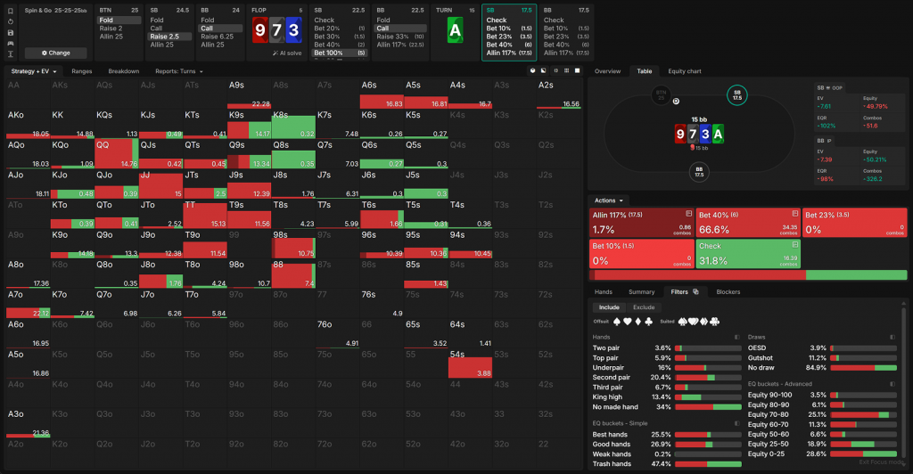 На этой доске на флопе уже было флеш-дро; следовательно, в среднем на терне будет больше дро, чем на предыдущей доске, поэтому мы должны ожидать, что сайзинг олл-ина будет использоваться чаще, чем раньше. Давайте проверим это с помощью агрегированных отчетов.