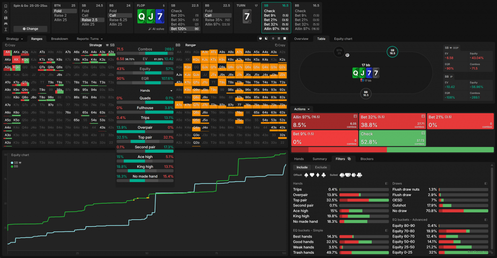 Обратите внимание, как преимущество в эквити смещается в сторону BB на терне . На флопе оверпары SB и лучшие топ-пары, такие как AQ, давали SB преимущество, но теперь эти руки являются огромными андердогами против новой категории трипсов.
