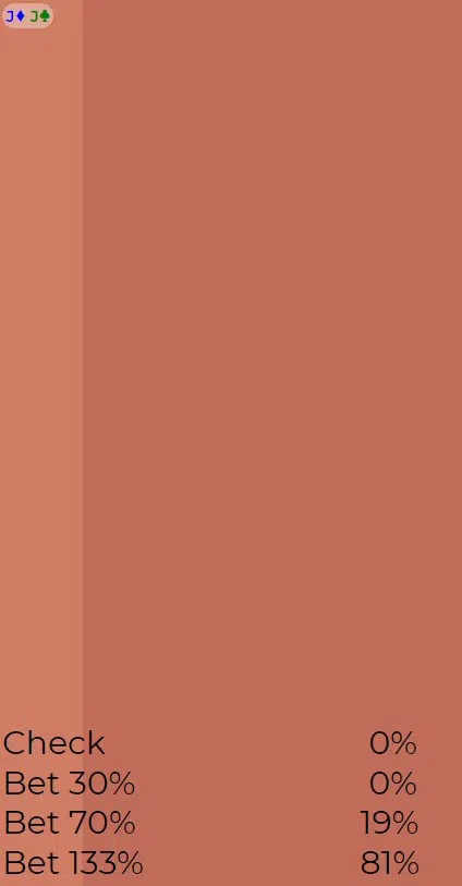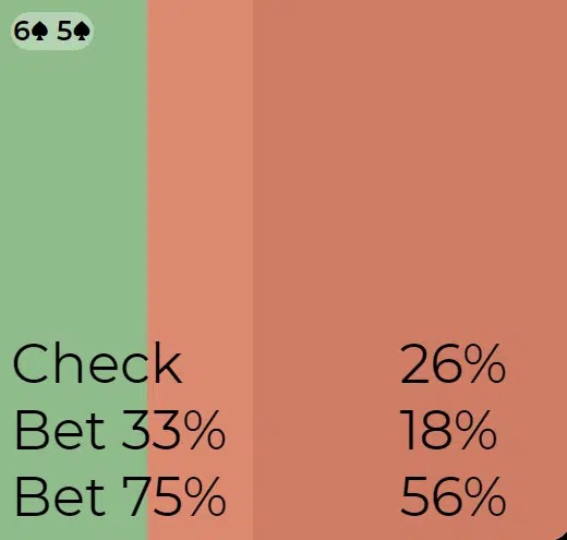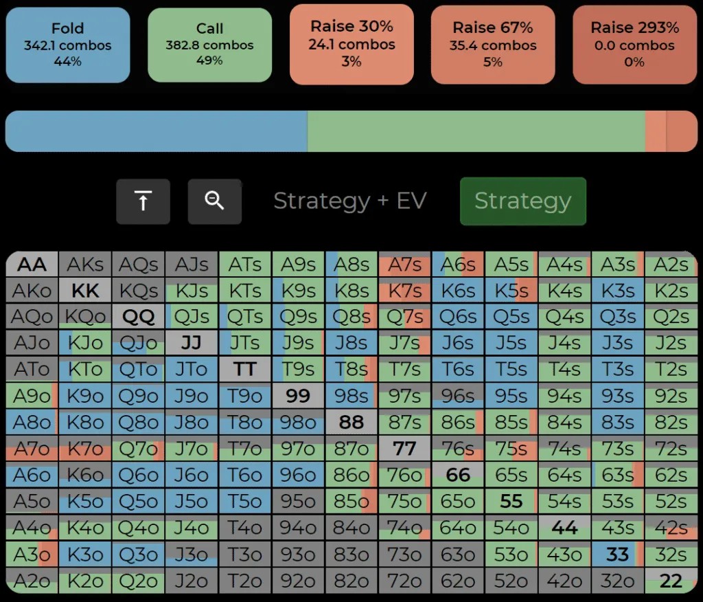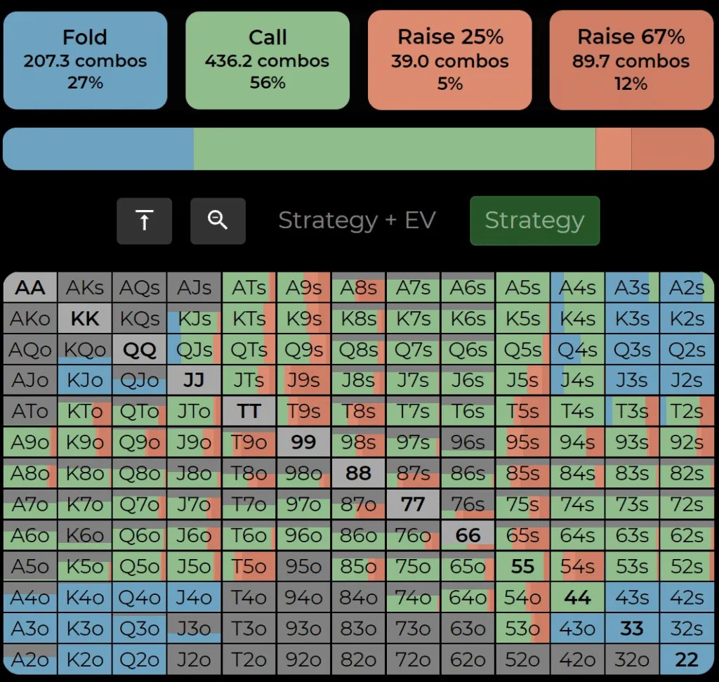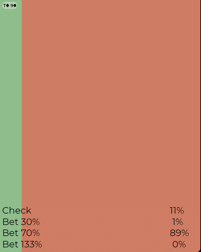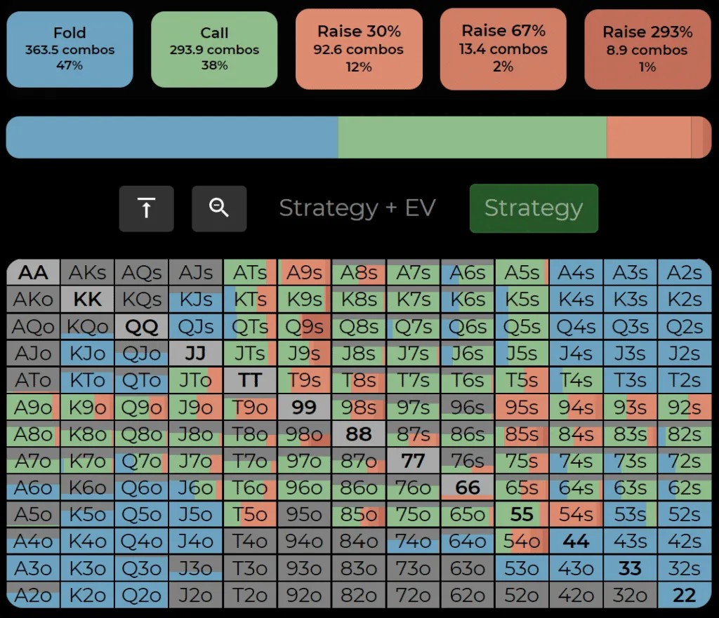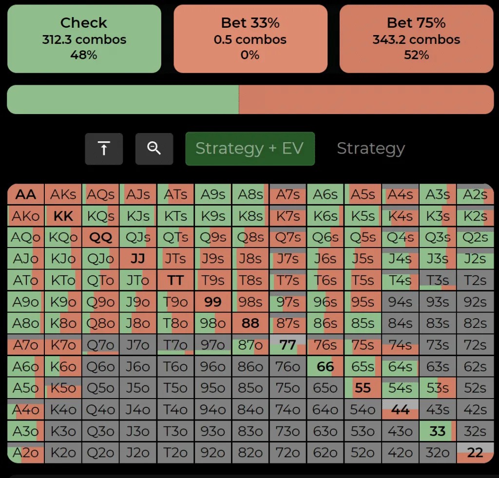 Небольшой сайзинг создает проблемы для рук с высоким эквити в вашем диапазоне. И это отражается в использовании баттоном небольшого размера ставки (33%) — солвер использует такой сайзинг лишь в 1% случаев.
