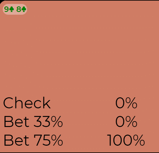 Большой блайнд чекает. В этом случае солвер предпочитает крупный конт-бет в 75% банка или чек.