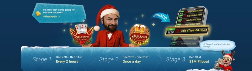 Программы GGCheers и GGCares обычно дают игроку право участия в турнире #ThanksGG Flipout на $100 000. Первая – в качестве празднования выигрыша крупного пота у сильной руки днем ранее. Вторая – для утешения игрока после жесткого бэдбита днем ранее. Только в конце года вместо привычного турнира проведут турнир с призовым фондом $1 000 000.