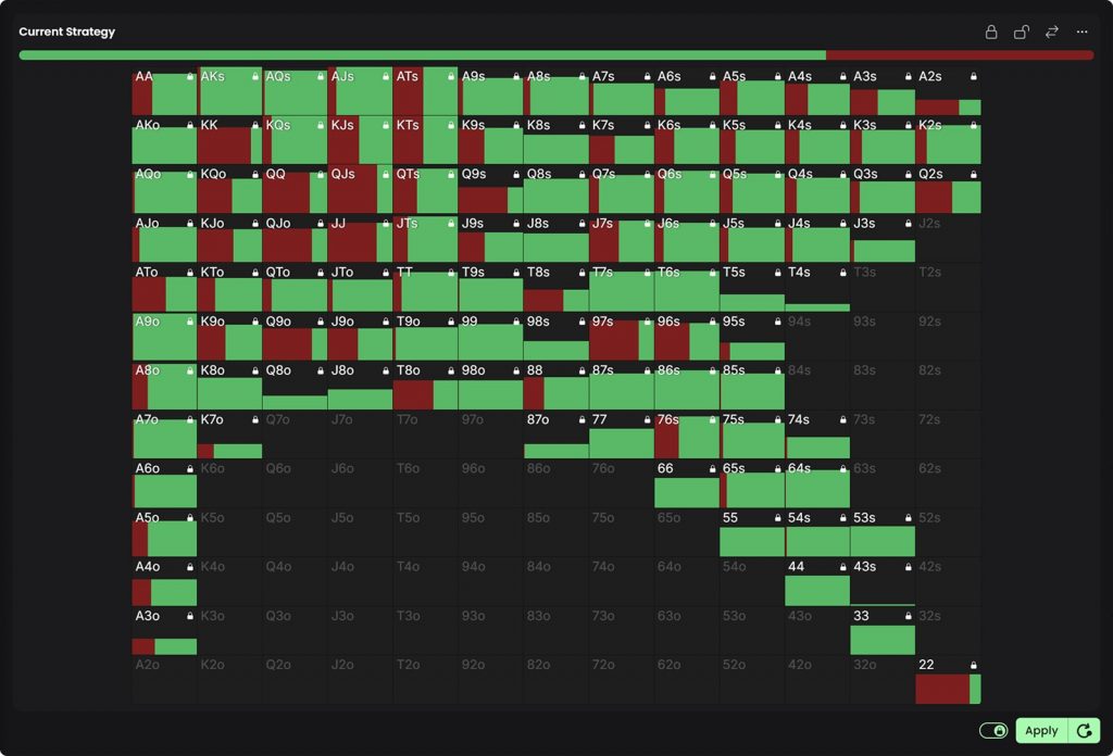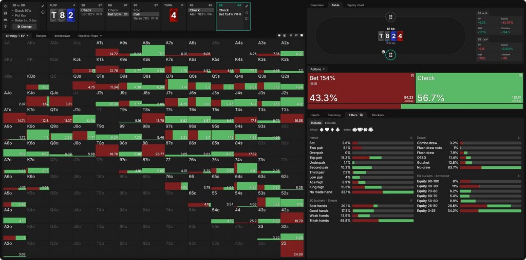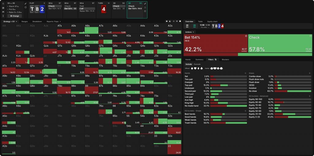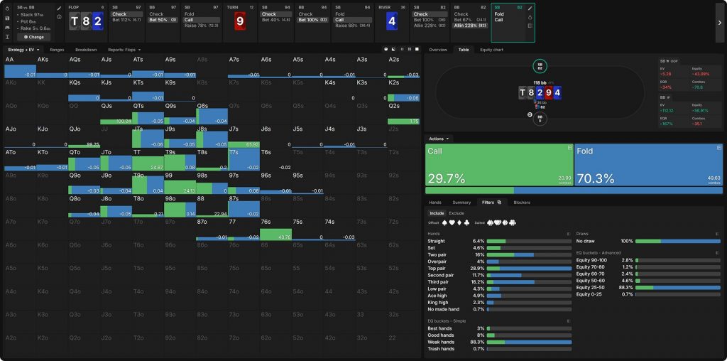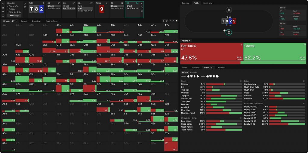 Результаты очень похожи на те, что мы видели ранее: QT+ — это приблизительный пороговый уровень для топ-пар, низкие стрит-дро часто чекают, флеш-дро + сильные стрит-дро составляют основную часть диапазона блефа.