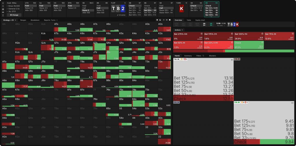 - Вероятно, это связано с тем, как OOP формирует диапазон XC на флопе: на средних/мокрых флопах, подобных этому, OOP не будет флоатить так много голых A/K-хай рук, что делает наши Kx довольно сильными, когда они получают пару на терне. Эта механика может отличаться на T-6-2 радугой, где OOP чек-коллит на флопе с большим количеством рук типа KQ и KJ.