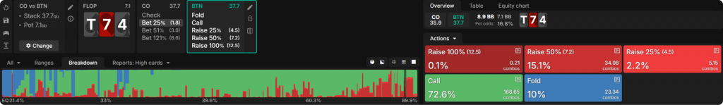 Чтобы понять 3-стороннюю стратегию в контексте, сначала посмотрим, как BTN отвечает на конт-бет размером в ¼ банка от CO в хедз-ап банке на доске . BTN играет ~10% фолдов, ~73% коллов и ~17% рейзов, предпочитая сайз рейза в половину банка. Его диапазон рейза достаточно поляризован, что уместно при использовании крупного сайзинга и возможности действовать последним: