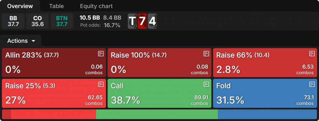 Однако, если в банке также находится BB, BTN отвечает на конт-бет в ¼ банка следующим образом: ~31% фолдов, ~39% коллов и ~30% рейзов, почти всегда выбирая наименьший сайз рейза — четверть банка: