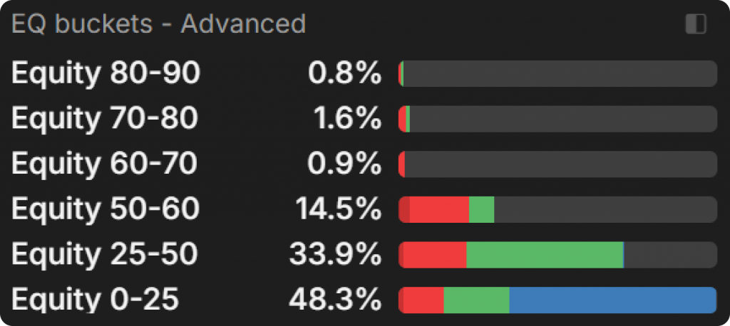 Мы в основном сосредоточимся на ситуациях сингл-рейз банка (SRP) и позициях CO-BTN-BB, так как это один из наиболее часто встречающихся 3-сторонних сценариев, а также случай, где рейз играет большую роль в ответе BTN на конт-бет, поскольку эквити распределены более равномерно, чем если бы рейзер находился на ранней позиции.
