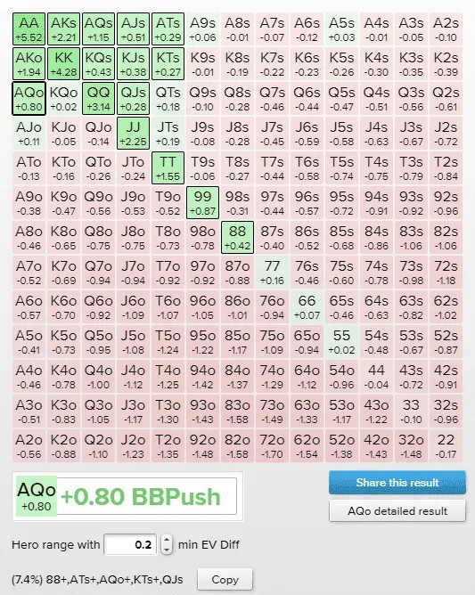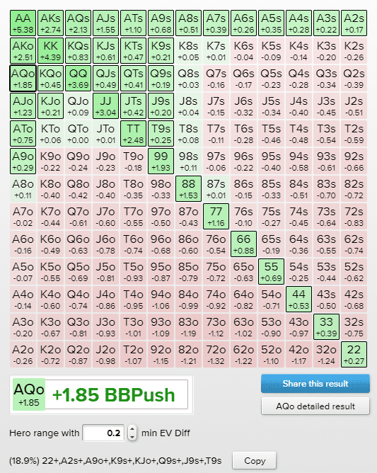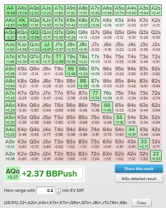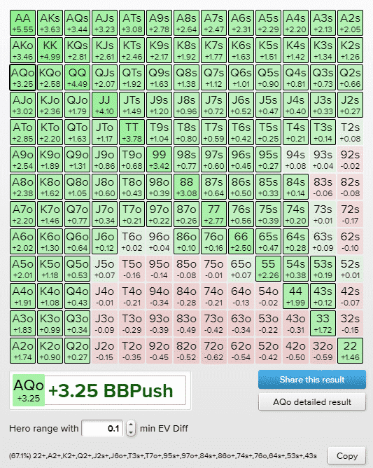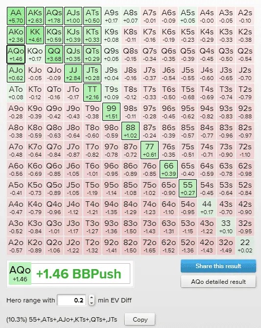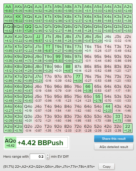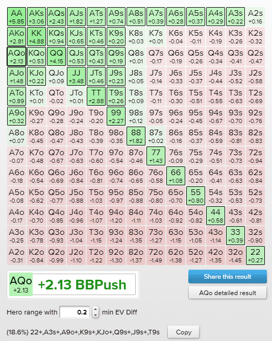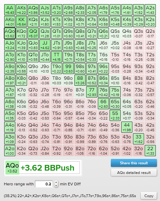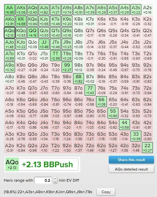 Как видно из изображения выше, руки, с которыми можно с легкостью пойти ва-банк, выделены ярко-зеленым цветом, поскольку их математическое ожидание превышает +0,2cEV. Руки, выделенные светло-зеленым, имеют положительное математическое ожидание, если разыгрывать их через пуш, но прибыль настолько мала, что в некоторых ситуациях рисковать всем стеком может быть нецелесообразно.