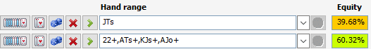 Как видно из приведенных ниже скриншотов, JTs обладают почти 40% эквити против довольно сильного диапазона: