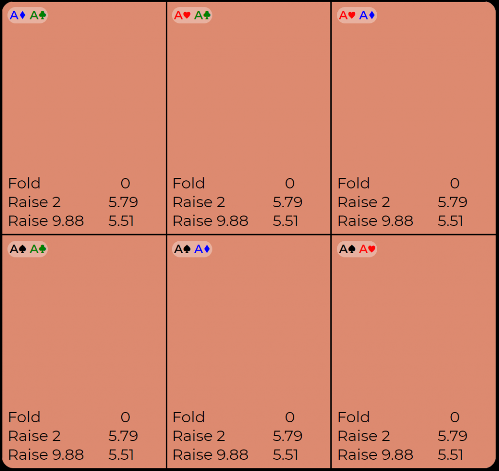 Программа, используемая для генерации этих диапазонов (ICMIZER), измеряет математическое ожидание в фишках (chipEV или просто cEV) каждой руки, если она разыграна через пуш. ChipEV измеряется в больших блайндах.